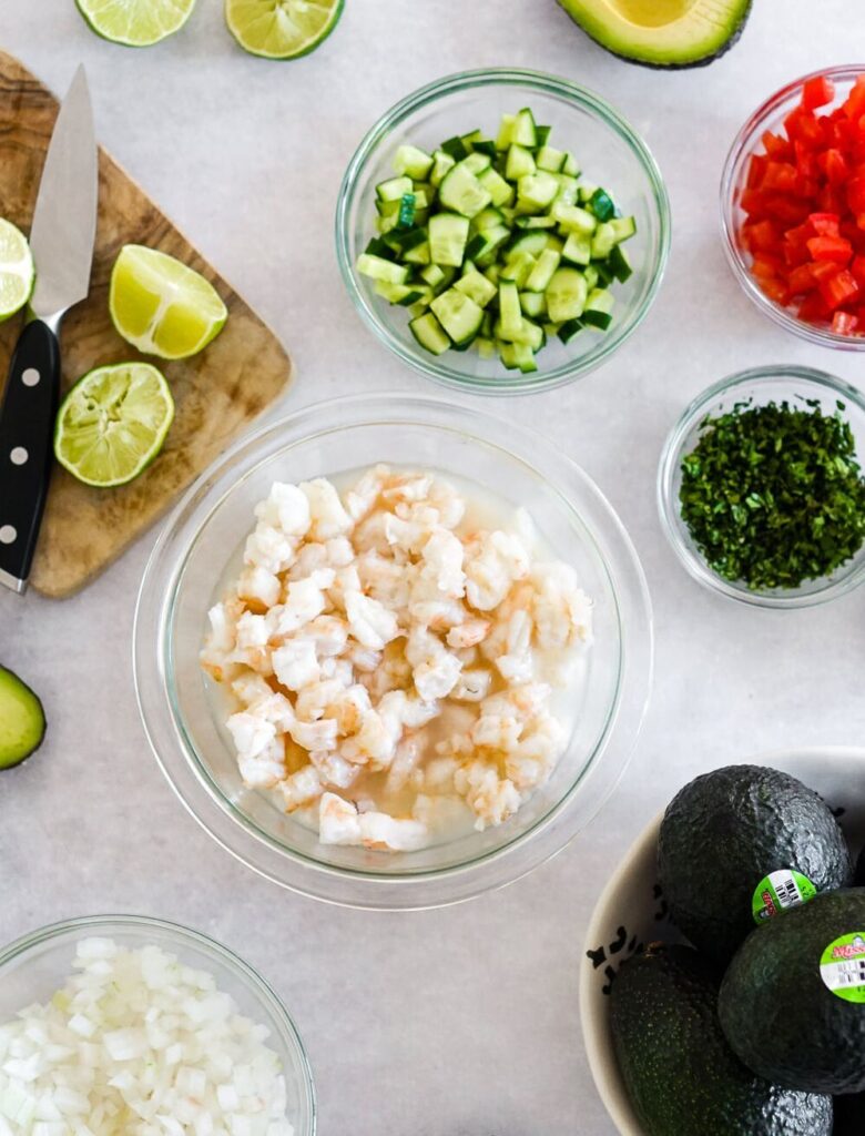 Note: if you’d rather use cooked shrimp instead of waiting for the lime to cook the raw shrimp, you can easily just chop up the cooked shrimp, mix it with all of the other ingredients, and refrigerate until you’re ready to serve it.
