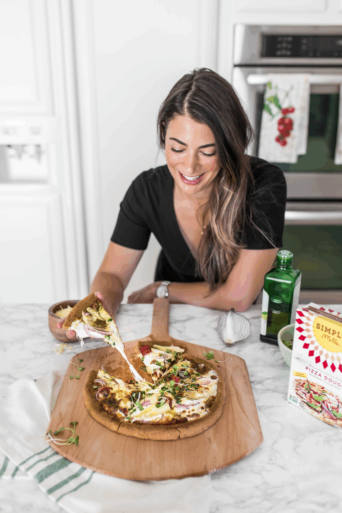 Can’t wait for you to try this pizza, I know you’ll love it!! As you’ve probably heard me say over and over… I really don’t believe in depriving cravings. I’d much rather upgrade those cravings with healthy ingredients so we can have our cake (or pizza) and eat it, too! If you’re craving pizza, have a pizza! Just make it with ingredients like Simple Mills crust so you’re totally satisfied while maintaining that healthy, balanced lifestyle. There’s literally an upgrade for every craving. They also have crackers, cookies, baking mixes, frostings… you name it! (You can check out how I used their baking mix in my coconut cupcakes).