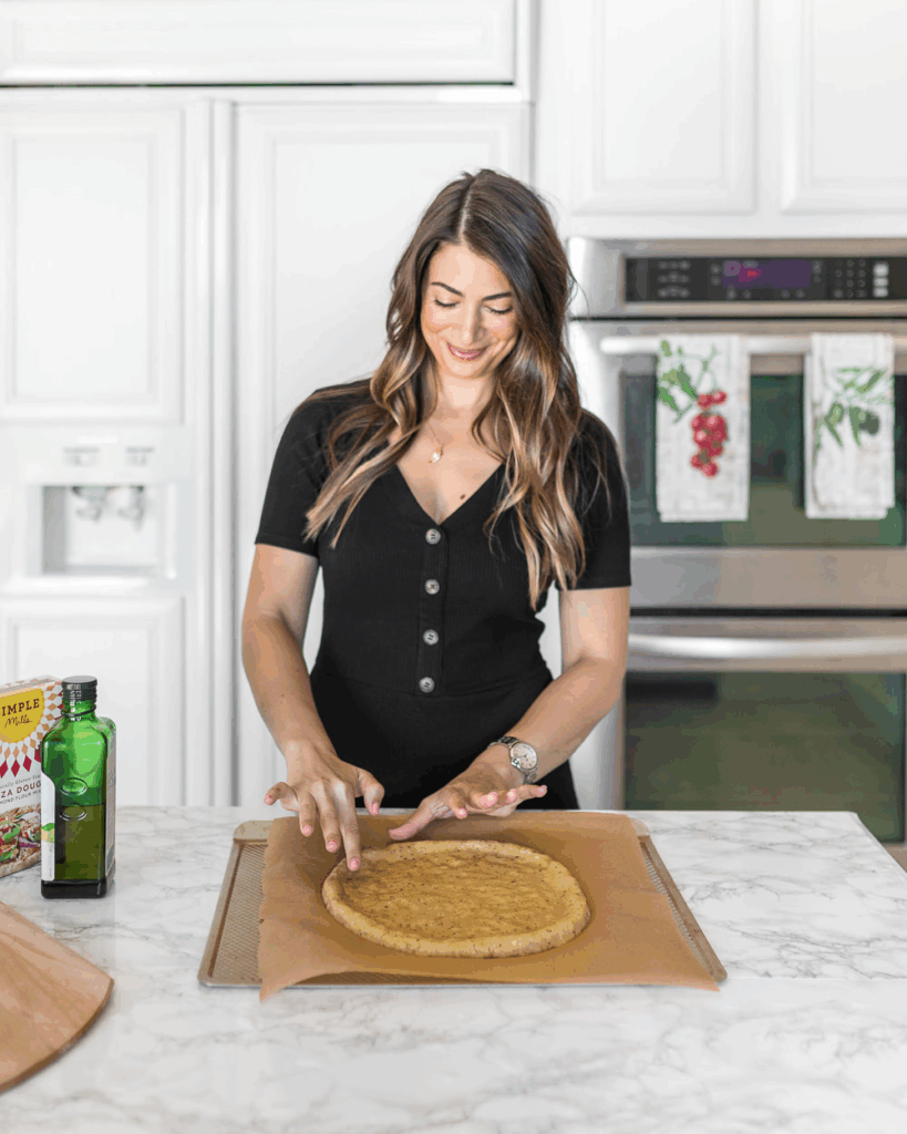 So there’s this artichoke pesto pizza at a restaurant in Encinitas called Nectarine Grove that I’ve been obsessing over lately. I get hit with a major, major craving for it at least once a week, and the last time I couldn’t stop thinking about it, I figured it was about time to try making my own version at home. But you guys know I’m not one to just whip up a pizza dough from scratch. No, thanks! I’m all about a good shortcut to make cooking as easy breezy as possible. But a typical store-bought dough wouldn’t do the trick either, especially with my healthy September Challenge that just ended. Then I thought… what about Simple Mills pizza dough mix!? It’s made with almond flour and flax and even cauliflower, and it only needs a couple ingredients added to it to make the dough. Ideal! So I ran out to Sprouts to stock up on my pizza dough mix and grab the other ingredients and raced back to the kitchen to make it happen.
