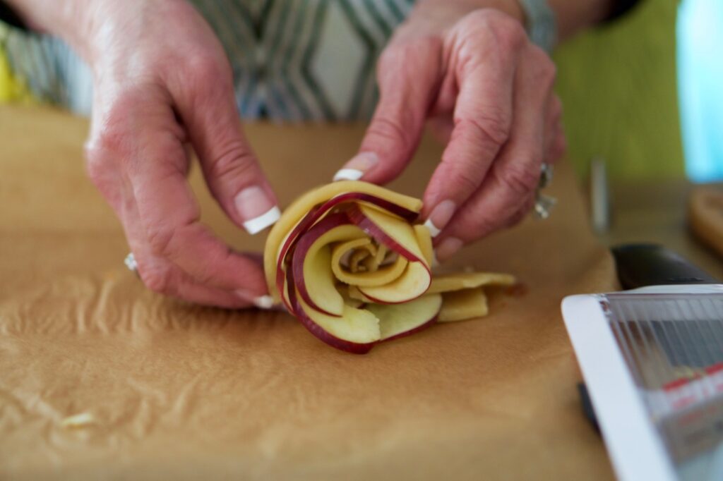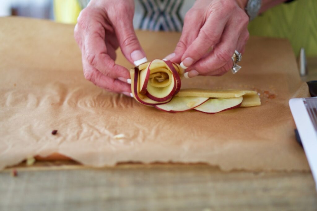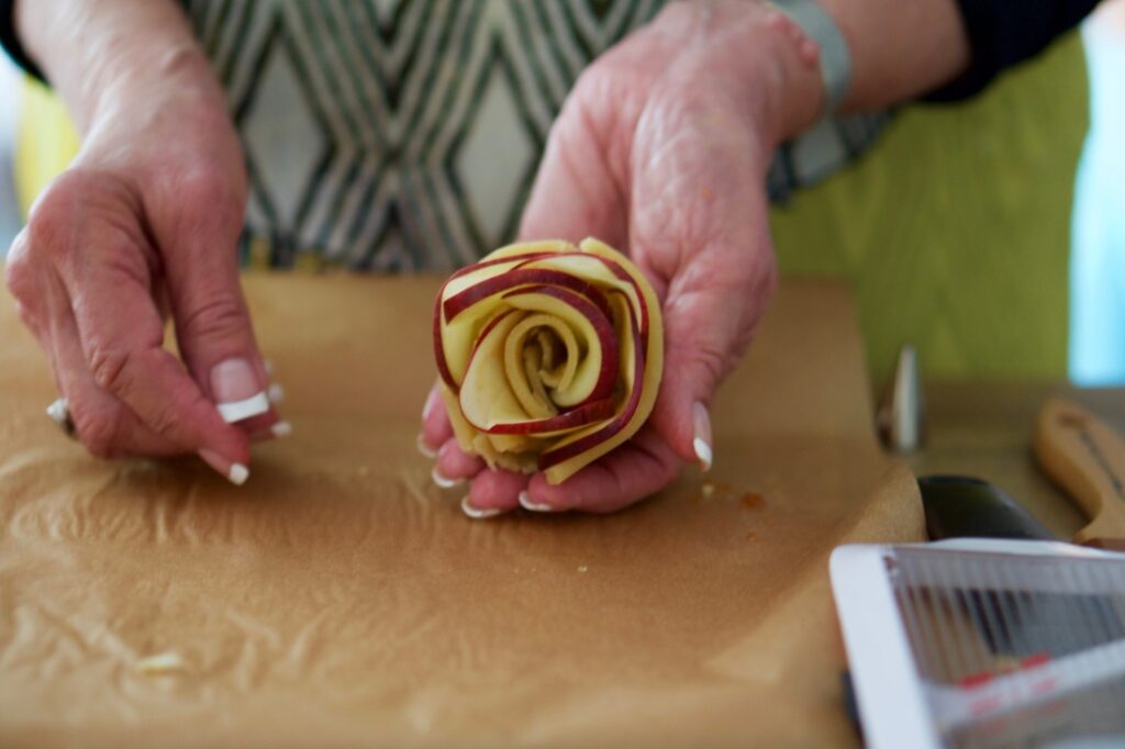 I’m so excited! It’s an extra special Wellness Wednesday today because I have an incredible guest star in today’s video teaching us how to make these beautiful Baked Apple Roses. The one and only Babé-le, my “grandma-in-law”, is a total domestic goddess and baking pro. She makes the most delicious cakes for everyone’s birthdays (and even did a special one for my bridal shower). She’s super talented in the kitchen and everything she makes is as pretty as could be. One of my absolute favorite things about Babé is she’s never afraid to try anything new. I’m always impressed when she runs out to the store to pick up a new healthy ingredient she just learned about in a recent blog post. The other day, I saw her drinking a giant bottle of matcha powder blended up with chia seeds and kale. She’s got a TON of energy (even without the matcha concoction!) and when she’s not cooking up a storm or writing stories for her book, she’s dancing around to her favorite Cuban music. QUITE the lady!