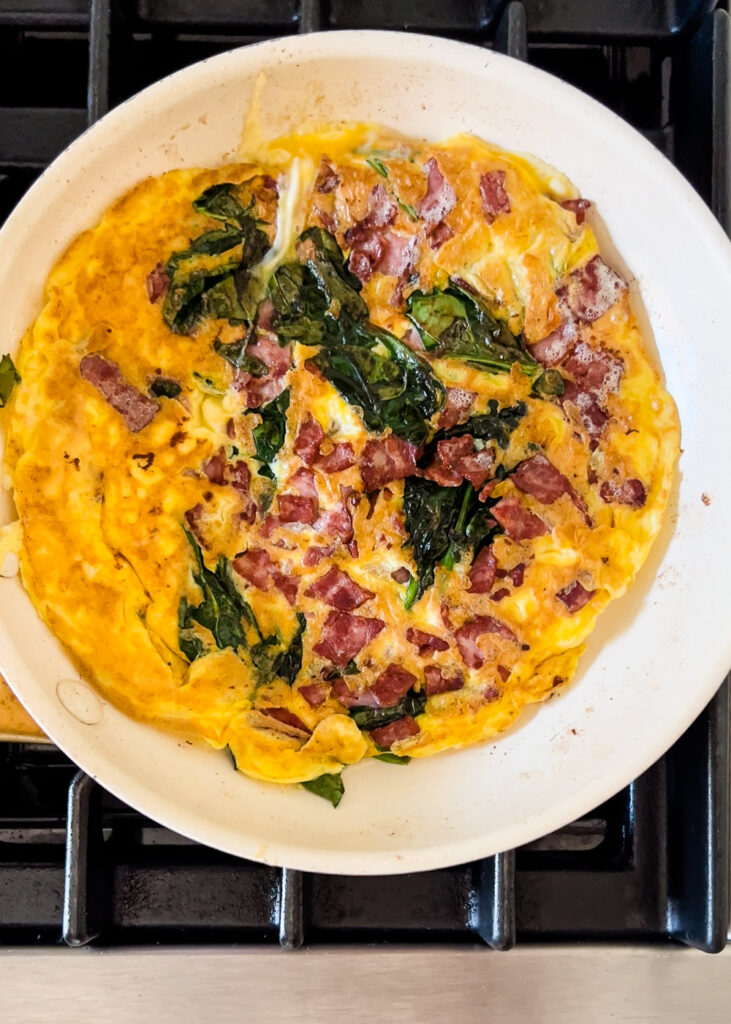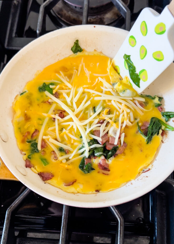 Sauté your veggies, add eggs, add cheese, and run spatula around the sides so it doesn’t stick.