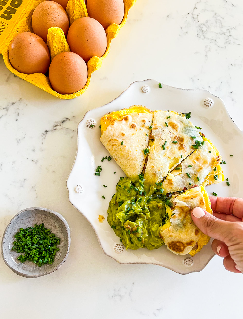 - Transfer to a plate, slice, and serve with guacamole or sliced avocado and chopped chives. Enjoy!!