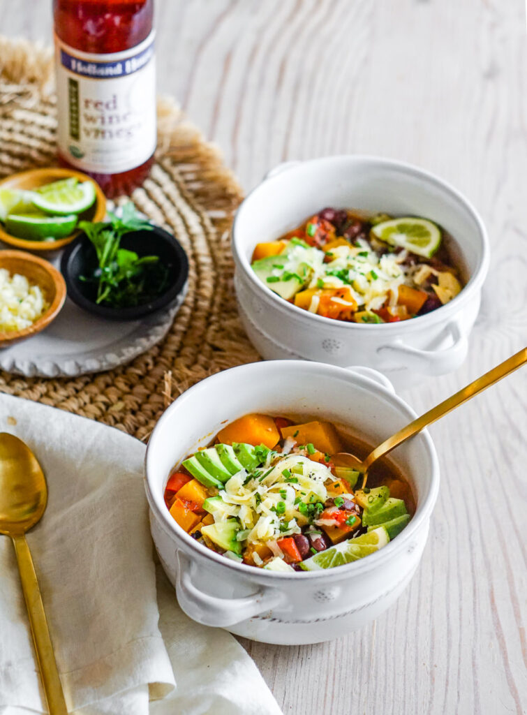 It’s officially chili season! Now that we’ve fully embraced fall and are inching closer to winter, whipping up a big batch of chili just feels like the right thing to do. I’m all about this vegetarian Black Bean & Butternut Squash Chili, which is so satisfying, full of fall flavors, and can be made in either a slow cooker, pressure cooker, or on the stovetop! It’s packed with butternut squash, warm spices, and extra bright flavor from Holland House® Organic Red Wine Vinegar, which is crafted from oak-barrel-aged wine and made with 100% non-GMO grapes. It’s finished off with a bunch of fun toppings like avocado, fresh herbs, lime, and shredded cheddar… it’s truly a big bowl of healthy, hearty fall comfort!