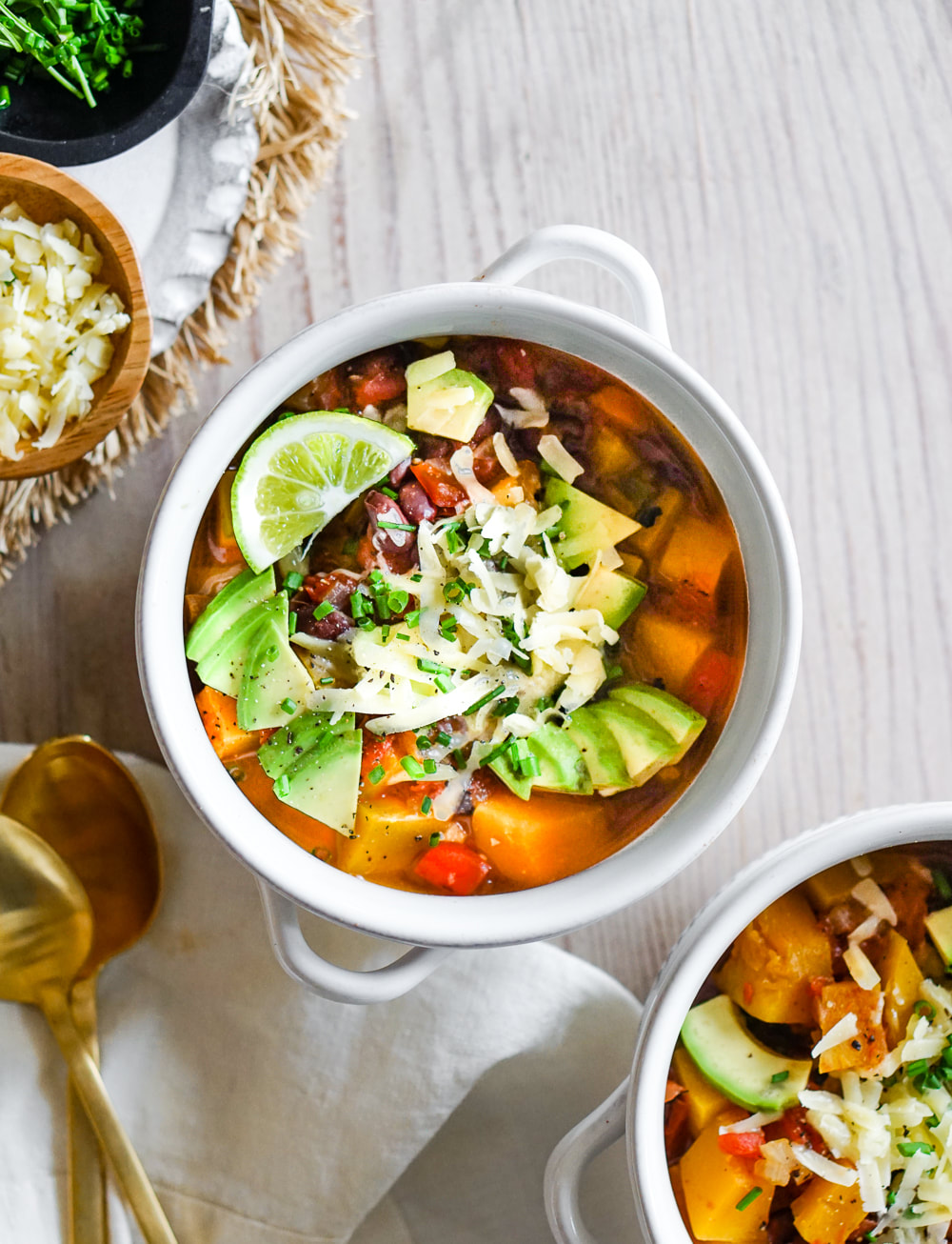 Toppings: chopped chives, shredded grass-fed cheddar, avocado, & a squeeze of lime juice