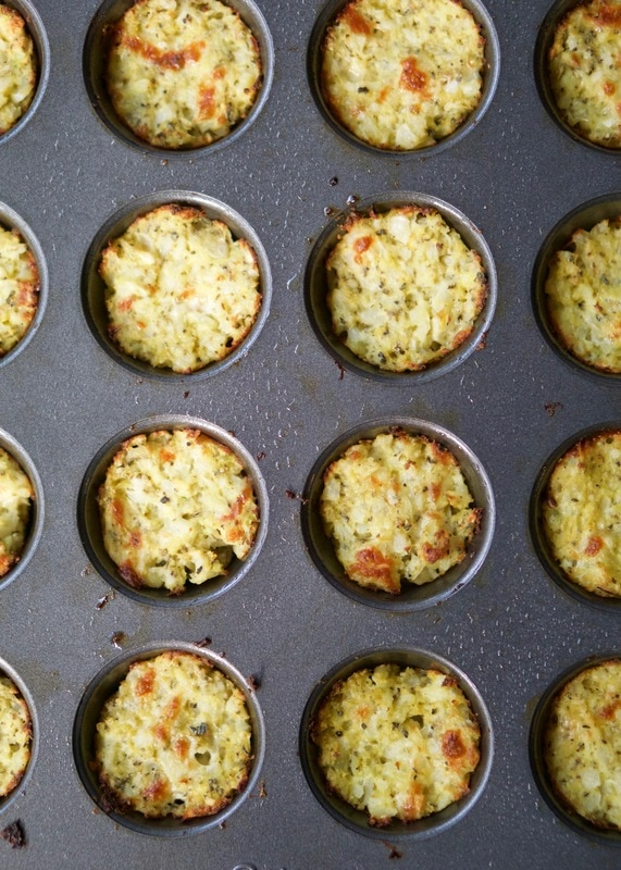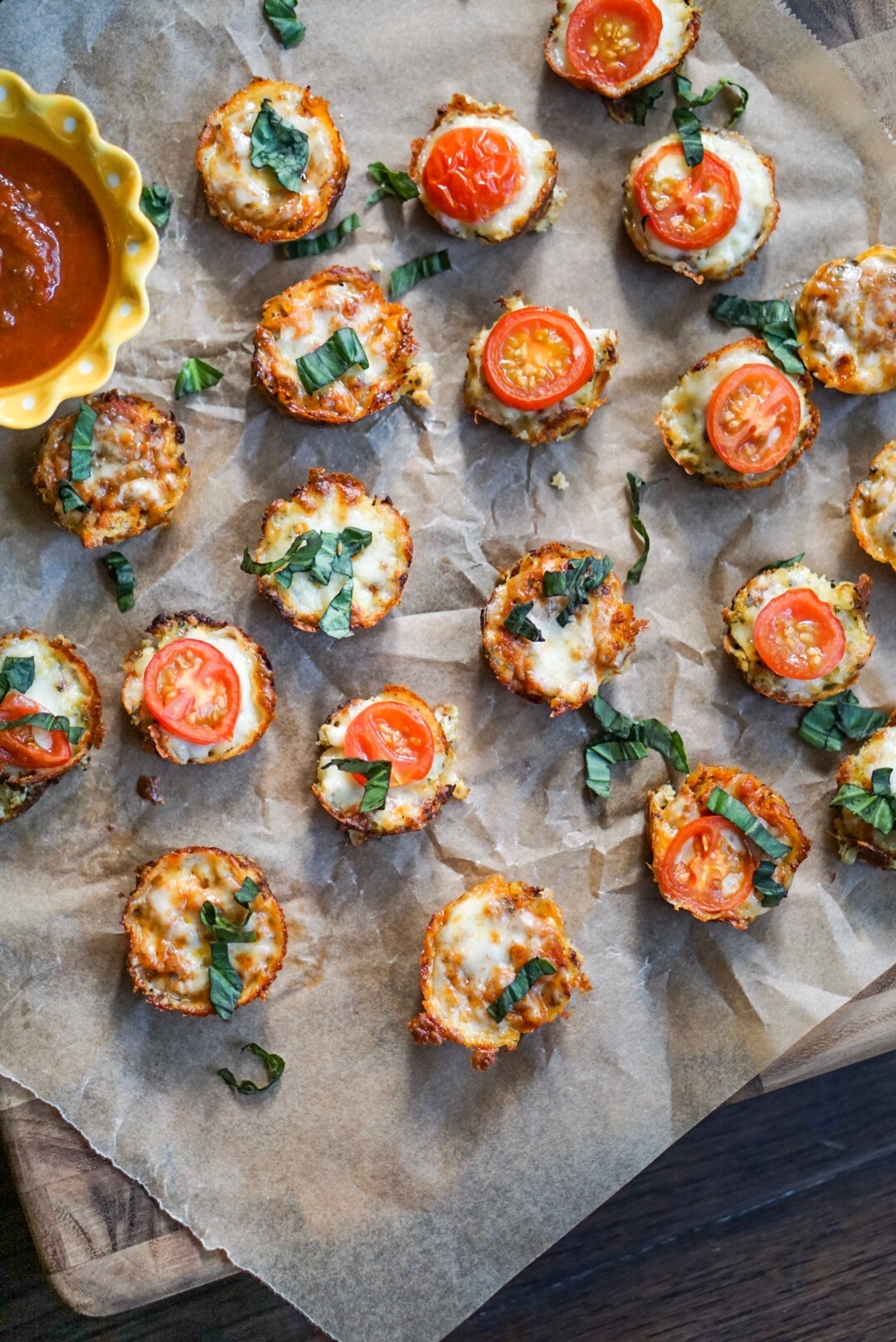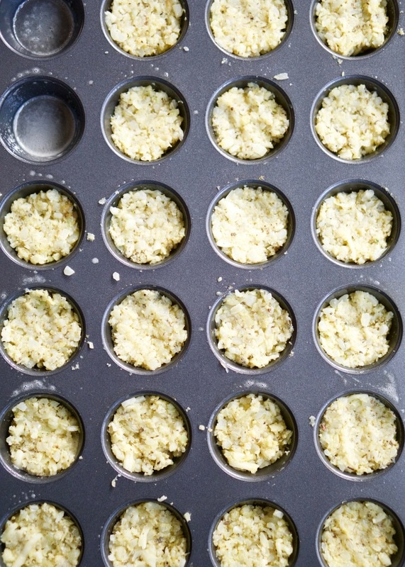 These pizza bites are pretty easy to whip up, especially when you buy pre-riced cauliflower. My freezer is stocked with organic riced cauliflower from Trader Joe’s – it makes healthy cooking super quick and easy. If you can’t find it pre-riced, making cauli rice in your food processor is no big deal and will only take a couple extra minutes.