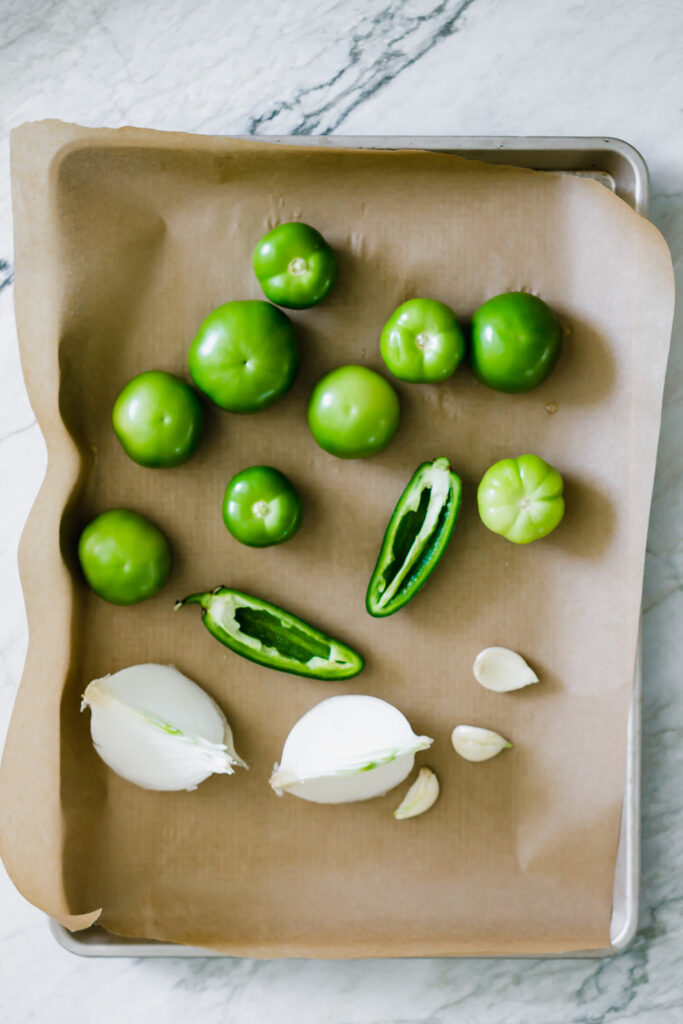 2. Place the tomatillos, onion, and jalapeño on a baking sheet. Roast in the oven for 15-20 minutes or until the tomatillos are tender, flipping the veggies halfway through, and adding the garlic cloves onto the baking sheet halfway through as well.