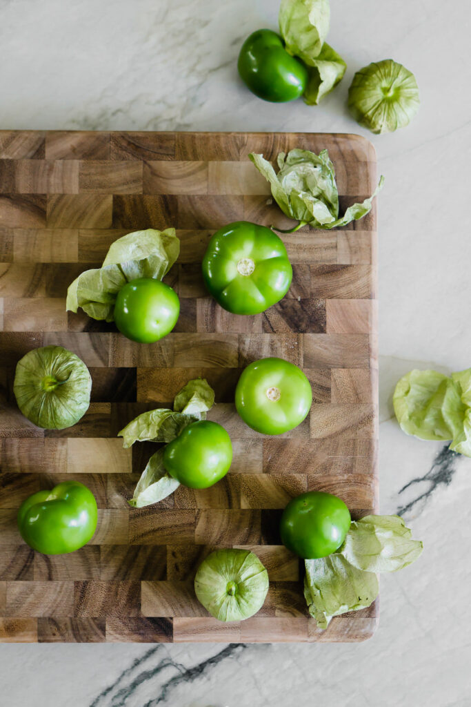 The tomatillos have a little peel called a husk. When you remove the husk, they’ll be a little sticky so just give them a quick rinse. Then you can put the whole tomatillos on a baking sheet with a jalapeño, onion, and some garlic, drizzle with avocado oil, and roast them up in the oven before turning into a delicious sauce in your blender! So easy, I promise.