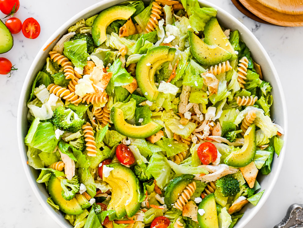 In true Weeknight Bite fashion, I obviously had to upgrade some of the salad ingredients to make it as healthy as possible. Rather than using a regular pasta, I used a lentil pasta that’s much higher in protein and fiber, and then I swapped regular pita chips for Simple Mills grain-free pita chips which are made with vegetable flours and flax seeds. Aside from that, I loaded it up with everything you’d see in my favorite CCC salad — cherry tomatoes, raw broccoli, shredded carrots, feta cheese, rotisserie chicken, and avocado — and then tossed it in a delicious balsamic vinaigrette. SO GOOD! You could totally make your own balsamic vinaigrette for this salad, but to make things extra quick and easy (some may call it lazy, I say it’s efficient!), I just used my favorite pre-made dressing.
