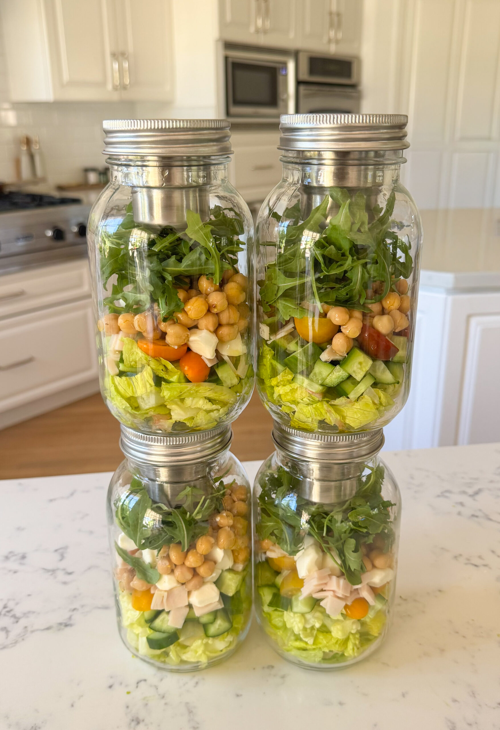 I also love making this salad as part of my weekly meal prep. I use the above recipe and divide it into 4 salad jars. I seriously look forward to my lunch every day when I know these are prepped and waiting for me. The key to a good salad-in-a-jar is making sure your salad doesn’t get soggy, and these jars are pretty fool proof. I added arugula to the jars below when I made them, which I know, I know, it’s not traditional in the famous La Scala salad, but I’m not a total purist and think it’s a perfect addition. Make them however your heart desires, and I promise they’ll be delicious!