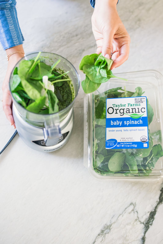 The combination of the fresh mint, lemon, and garlic just screams Summer, plus you get an extra nutrient boost by adding a nice big handful of Taylor Farms Organic Baby Spinach in there too. My Italian cooking school teacher would probably be rolling his eyes if he heard me talking about a pesto that doesn’t have any basil in it, but just trust me here, this one is a keeper! This simple pesto would also be the perfect sauce for a pasta dish or served over some grilled chicken, shrimp, or wild fish! Here’s how to make it all come together…