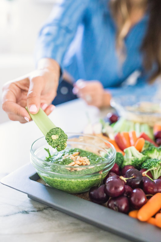 And now for the dips – I have a few go-to’s. I like to offer a variety of dips so that there’s something for everyone! First, hummus. And here’s another sneaky shortcut… I always buy a store-bought hummus (make sure to check the label for simple, clean ingredients), and then I scoop it into a bowl and top it with some za’atar seasoning and a drizzle of olive oil. It makes it look extra fancy and gives it a lot more flavor, too! Besides hummus, Romesco Sauce is always a fan favorite. And last but definitely not least, this Mint & Spinach Pesto. OMG wait until you try it… it’s seriously so fresh and delicious!