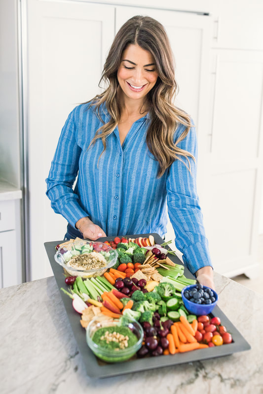 There are two keys to a fab crudité board. One – fresh, seasonal produce. And two – delicious dips. For my produce, I partnered with Taylor Farms and took a little shortcut by using their organic veggie tray and taking their pre-cut veggies straight from their package and putting it onto my giant platter – makes it so much easier! (Shhh, no one will know you didn’t actually do all the chopping yourself!). The veggie tray is packed with all kinds of nutritious and fresh veggies, such as broccoli, carrots, celery, and tomatoes which will pair perfectly with the dressing that comes in the tray or with any of your favorite dips. I also added some fresh fruits, such as peaches, cherries, and blueberries that I always keep stocked in my fridge during the summer!