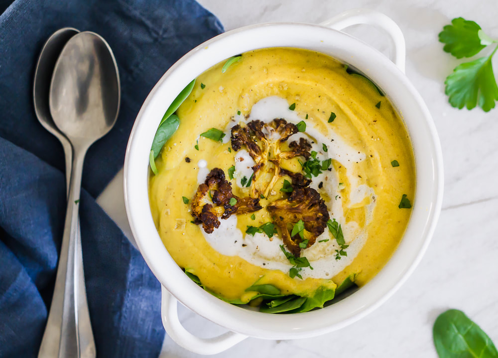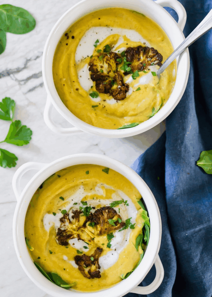 Honestly, there are just not enough delicious words to properly describe this soothing and cozy soup… you’ve just got to try it for yourself! But I have to say, I think this is my favorite soup I’ve made on the blog yet! I made it on an afternoon when I was craving something comforting and filling, and wanted it to be extra healthy after a weekend of dining out. I thought about an old recipe that I had on the blog for a cauliflower and turmeric soup and decided it was time to make a fresh, new rendition of it with a little more flavor and oomph. The original recipe used sautéed cauliflower, and I knew it would have way more flavor if I roasted it instead with some onion and garlic. I added in more spices this time around, some coconut milk for extra silkiness, and some spinach and chicken sausage to make it extra filling (the sausage is totally optional though… this soup is a great vegetarian/vegan option without it!). It’s ended up being the perfect makeover to the old tried-and-true recipe, and I am super excited to share the new and improved version with you!