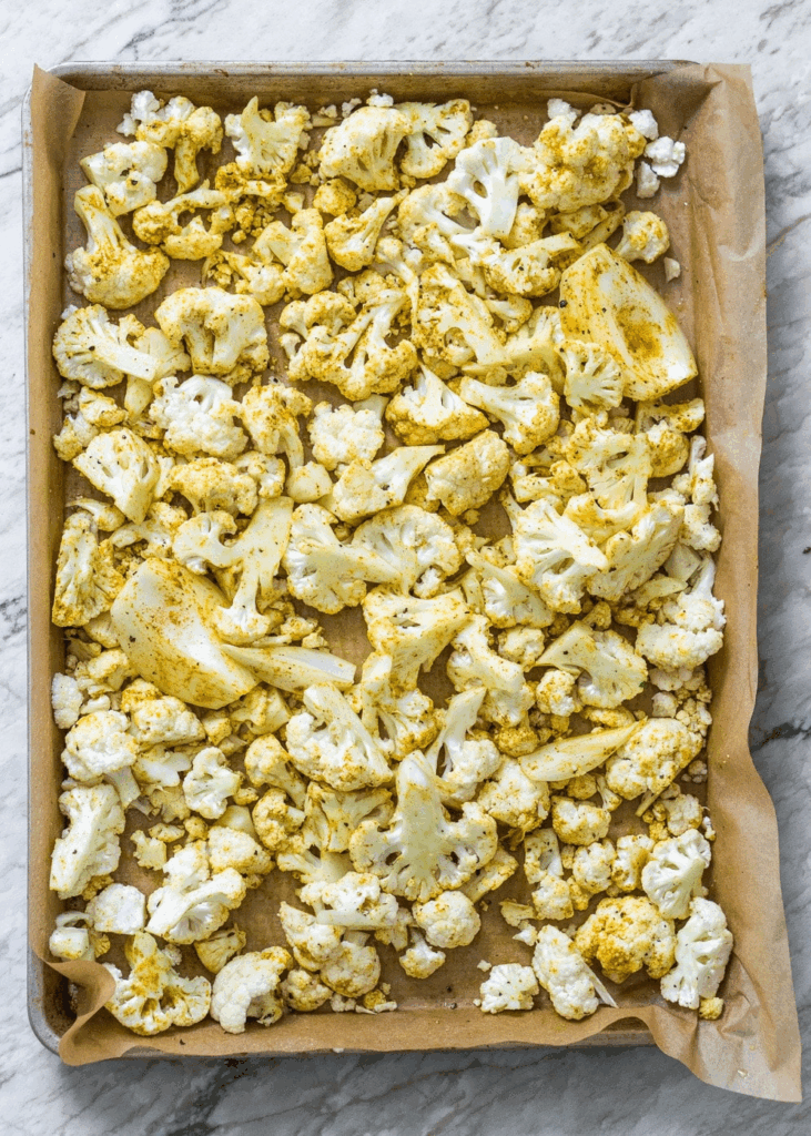 - Place the cauliflower florets and onion on the parchment-lined baking sheet. Drizzle with avocado oil (or spray avocado oil spray to evenly coat cauliflower), then season with 2 teaspoons of curry powder and some salt and pepper. Toss so the cauliflower is evenly coated and seasoned.