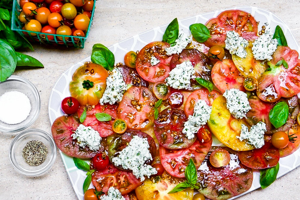 You guys ready for the easiest, juiciest, and most beautiful salad ever? I know that’s promising a lot here, but THIS Heirloom Tomato Salad with Herbed Ricotta is about to change your summer. There’s so few ingredients in this salad and it literally takes about 5 minutes to make, and I can guarantee you that people are going to be so impressed when you serve it at your 4th of July party. It’s all thanks to the super sweet and colorful heirloom tomatoes, the total showstopper here. Heirlooms are already perfect as is, but once you pair them with the basil ricotta and a garlicky balsamic vinaigrette, it’s unreal! I saw this salad while flipping through the June issue of Cooking Light and flagged the page to remind myself to make it once heirloom tomatoes showed up at my Farmer’s Market. Well the day finally came and I couldn’t wait another second to try it out and share it with all of you!