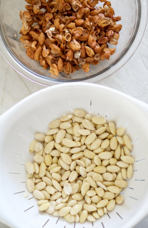 3. Optional step: peel the skin off the almonds by pinching the almond – it should easily pop out and separate from the skin. This step makes the almond milk extra creamy, but if you want to skip it, you’ll still end up with some amazing almond milk!