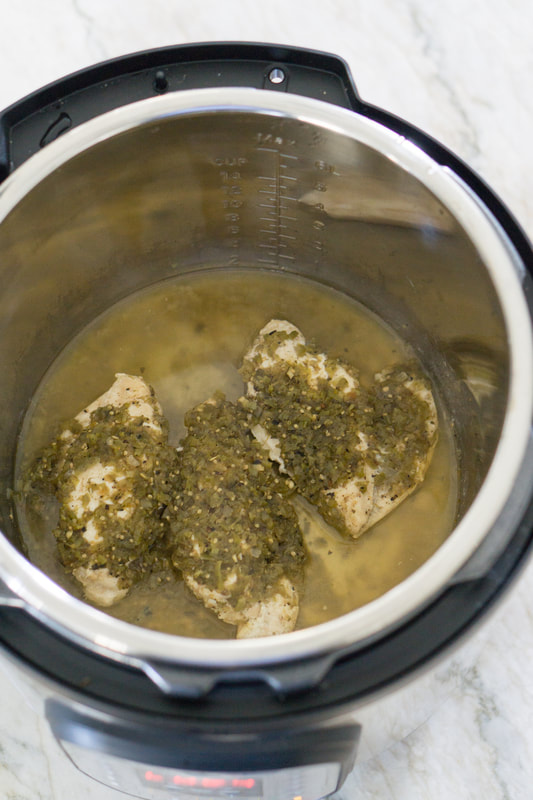 - Place the seasoned chicken in your instant pot. Pour your favorite salsa over the chicken.