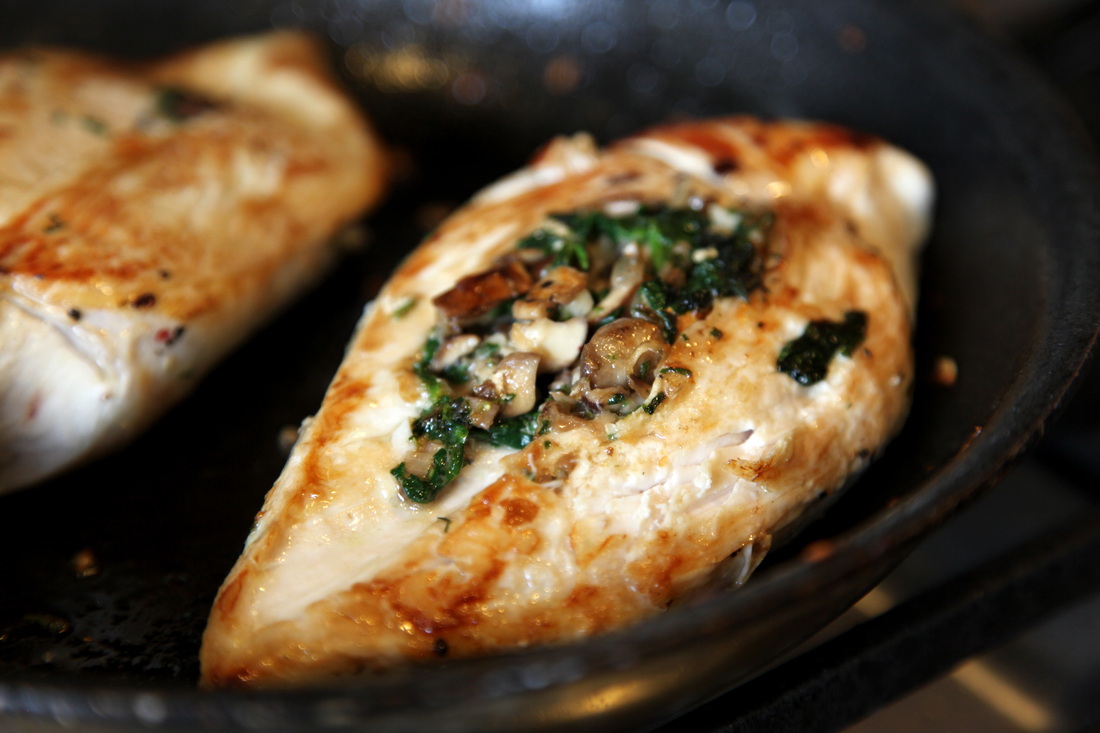 Chicken is usually my go-to for dinner – it’s quick, lean, healthy, and it’s not too hard to make it taste good. But sometimes chicken gets a little boring and repetitive. I figured why not shake things up a bit, and instead of just serving veggies on the side of my chickie, I’ll stuff them into my chicken breasts! It turned out to be super flavorful, and even though it’s really easy to make, it looks very impressive. Now that I know how simple it is to make delish stuffed-chicken breasts for dinner, I can’t wait to experiment with tons of other veggies and fresh herbs. One of my favorite flavor combos is fresh thyme and mushrooms (like this WNB recipe!), and combined with garlic, shallots, spinach, and freshly-grated parmesan cheese, it’s amazing! Seriously, I could have just eaten this stuffing on a toasted baguette, and it would have made for a mean crostini!