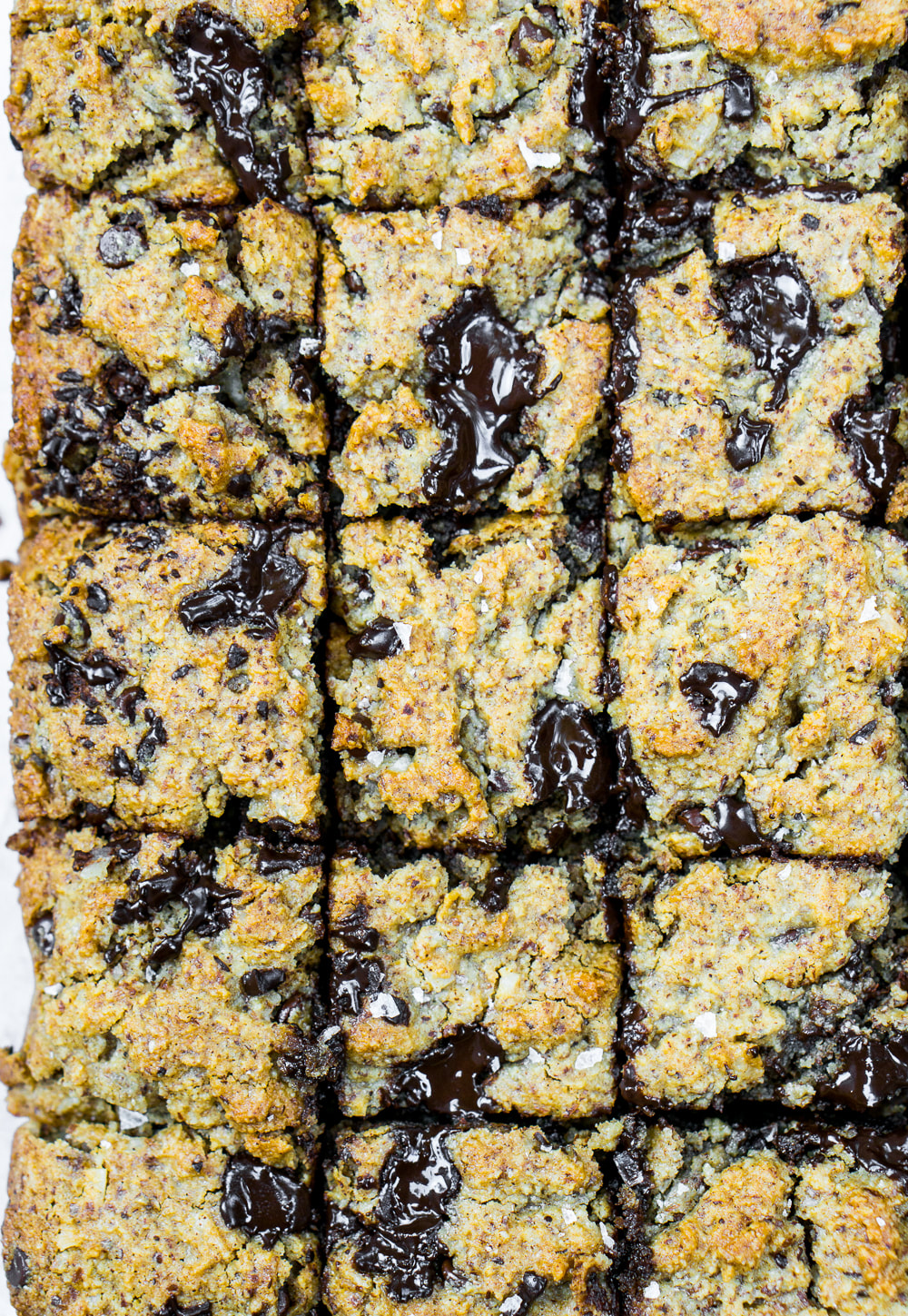 I mean… couldn’t you just dive right into those melty pools of chocolate? I seriously can’t get enough of these Paleo Blondies – they taste so decadent, you’d never know they were grain-free and refined-sugar free. I originally shared this recipe almost exactly 5 years ago… my friend Loren from Sweet Loren’s was in town for Expo West, and she stopped by to catch up and bake this insanely delicious recipe so I could share it right here with all my fellow dessert lovers! Since this is one of my favorite dessert recipes, I felt like it was time to give the photos a makeover to really do the recipe justice. So here we are with a fresh new look, but the same delicious recipe! (And if you want a peek at what the old photos looked like… scroll down to the bottom – we’ve come a long way my friends! I can’t bear to get rid of my old videos either, so that’s here to stay, too!)