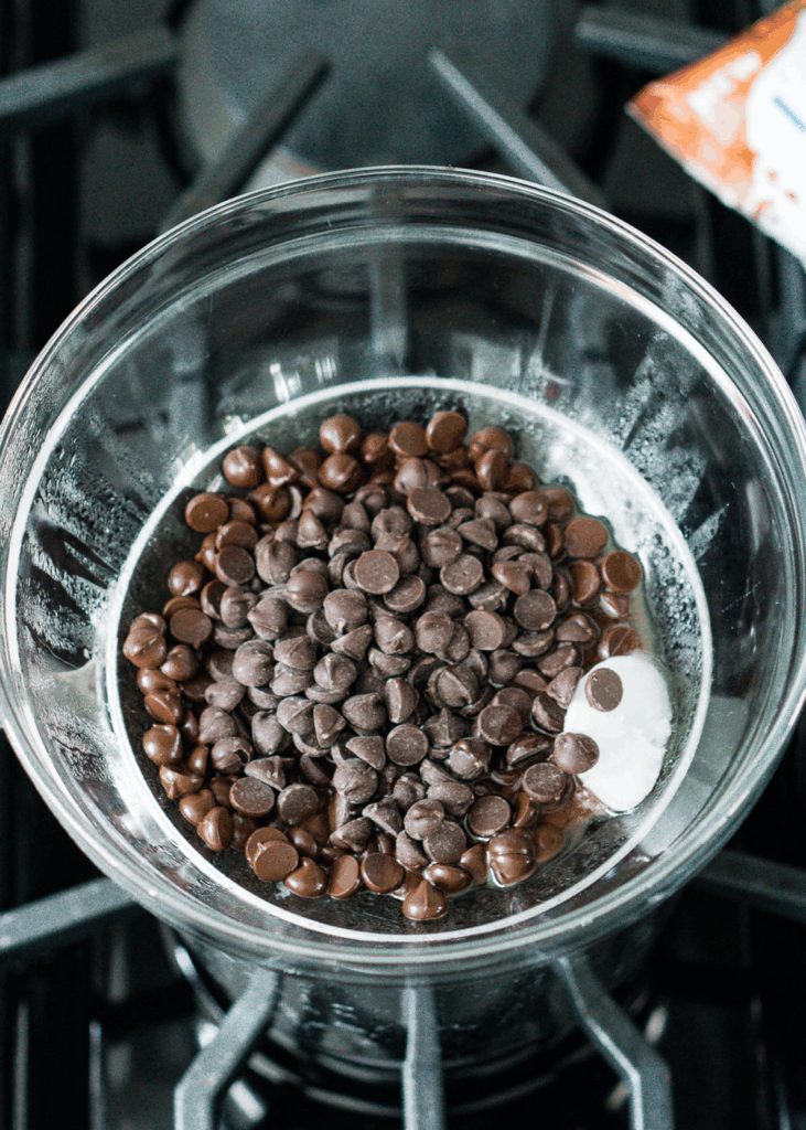 You can melt the chocolate chips in the microwave, but just be careful to stir frequently (about every 30 seconds) otherwise the chocolate can burn pretty easily. I prefer to do it in a make-shift double boiler – you can see what I mean in the photos below! To do this method: