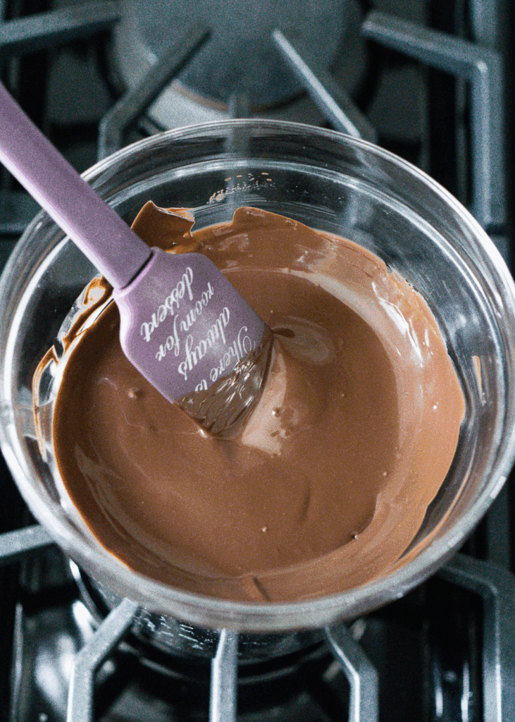 - Add the chocolate chipsย to the glass bowl with 1 tbsp coconut oil and stir every minute or so until melty and smooth. Remove from heat, stir in peppermint oil, and get dipping right away!