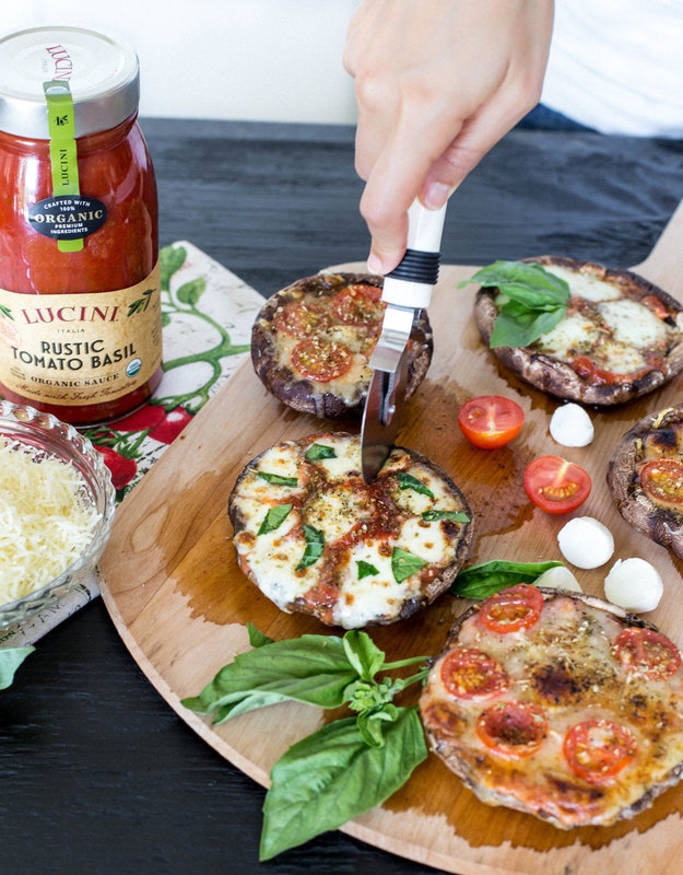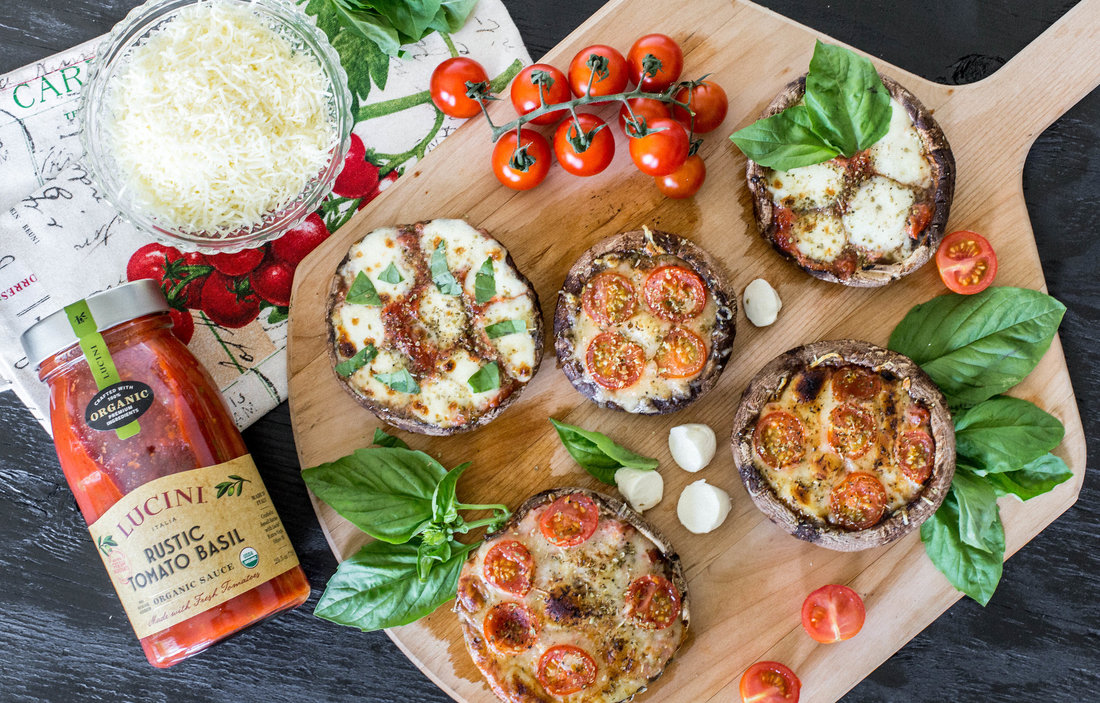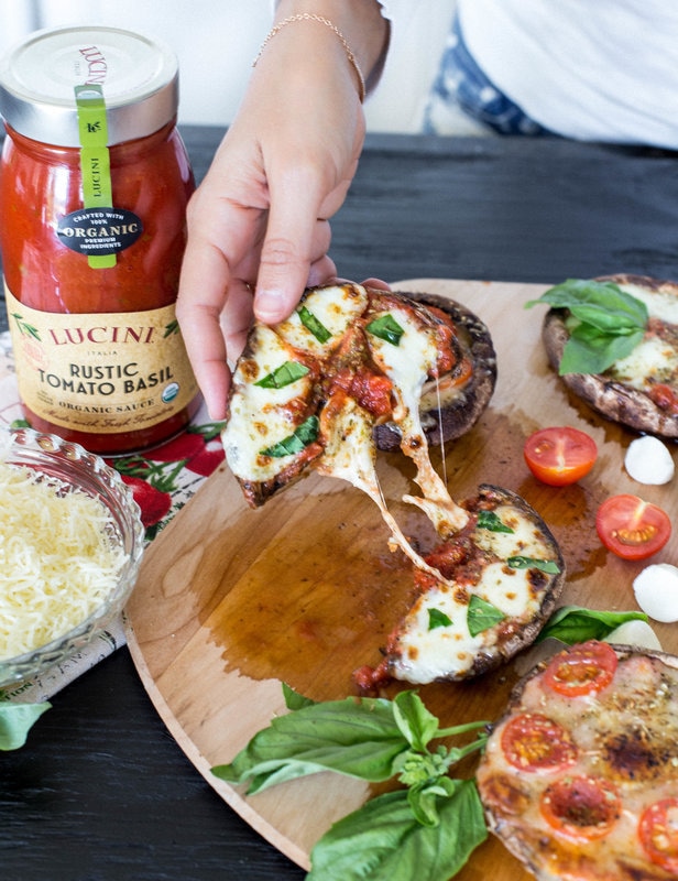 All you need to make these pizzas are the portobello caps, my favorite organic Rustic Tomato Basil sauce from Lucini (which I love because the ingredients are super clean and have a ton of flavor) and all of your favorite pizza toppings. I kept it pretty simple and went with two types of organic mozzarella cheese (shredded and buffalo), cherry tomatoes, fresh basil, and oregano, and they were a huge hit! Feel free to get creative with your toppings – you really can’t go wrong!