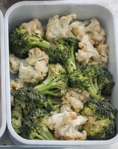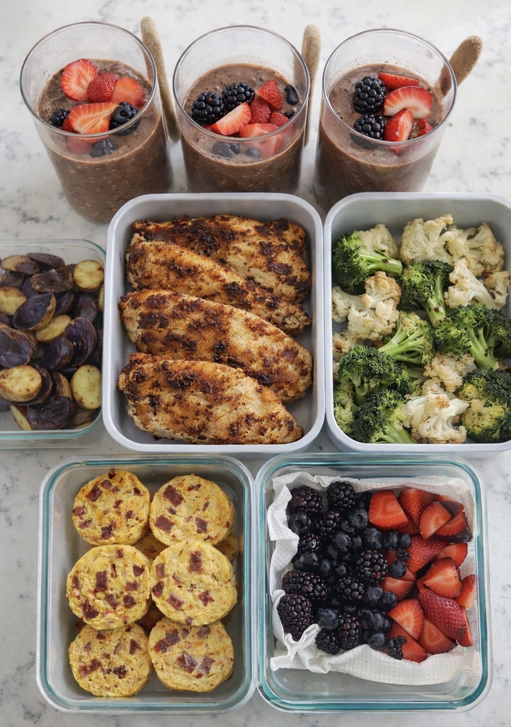 Start by roasting your veggies, and while those are roasting, cook up your chicken. Then blend up your egg bites ingredients and pop those in the oven while it’s still warm after the vegetables. Finish up by washing your fruit and prepping your overnight oats. Ok, let’s do this (and check it all out in this reel)!
