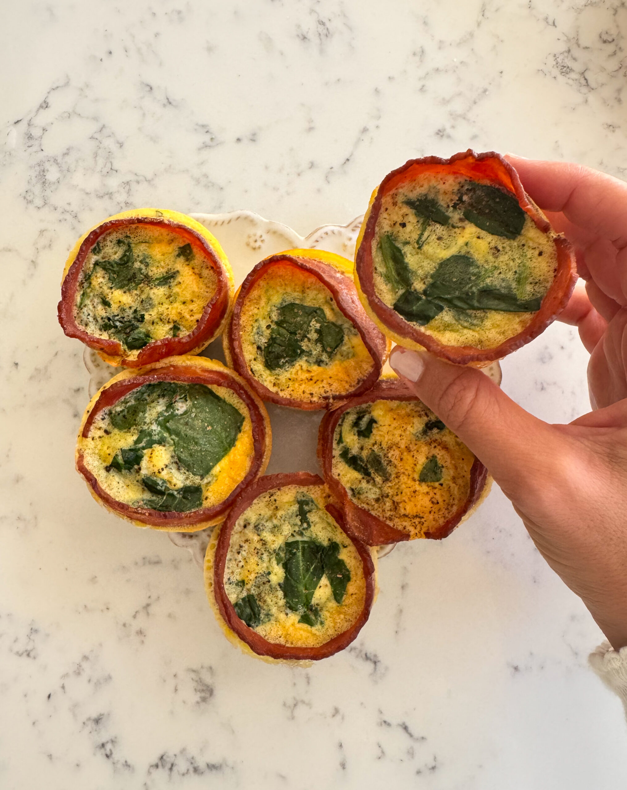 These are one of my favorite grab-and-go protein options to keep in the fridge. Theyโ€™re super easy – made with 5 ingredients – filling, and feel a little more special thanks to the bacon or turkey bacon wrapped around the edges. See the recipe below.