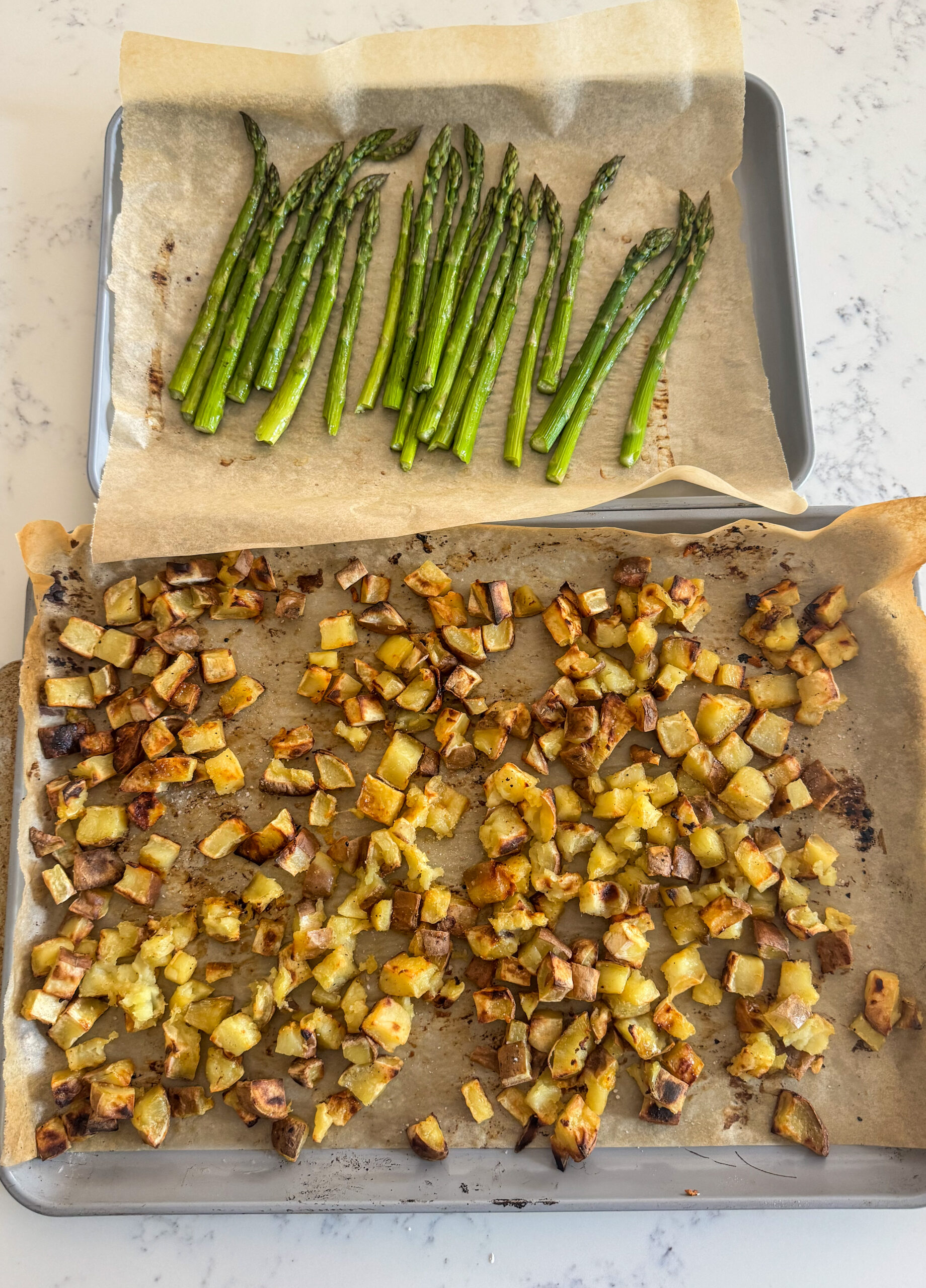 4. When the potatoes have about 10 ish minutes left, add the sheet pan of asparagus and roast until it’s just tender and a vibrant green.