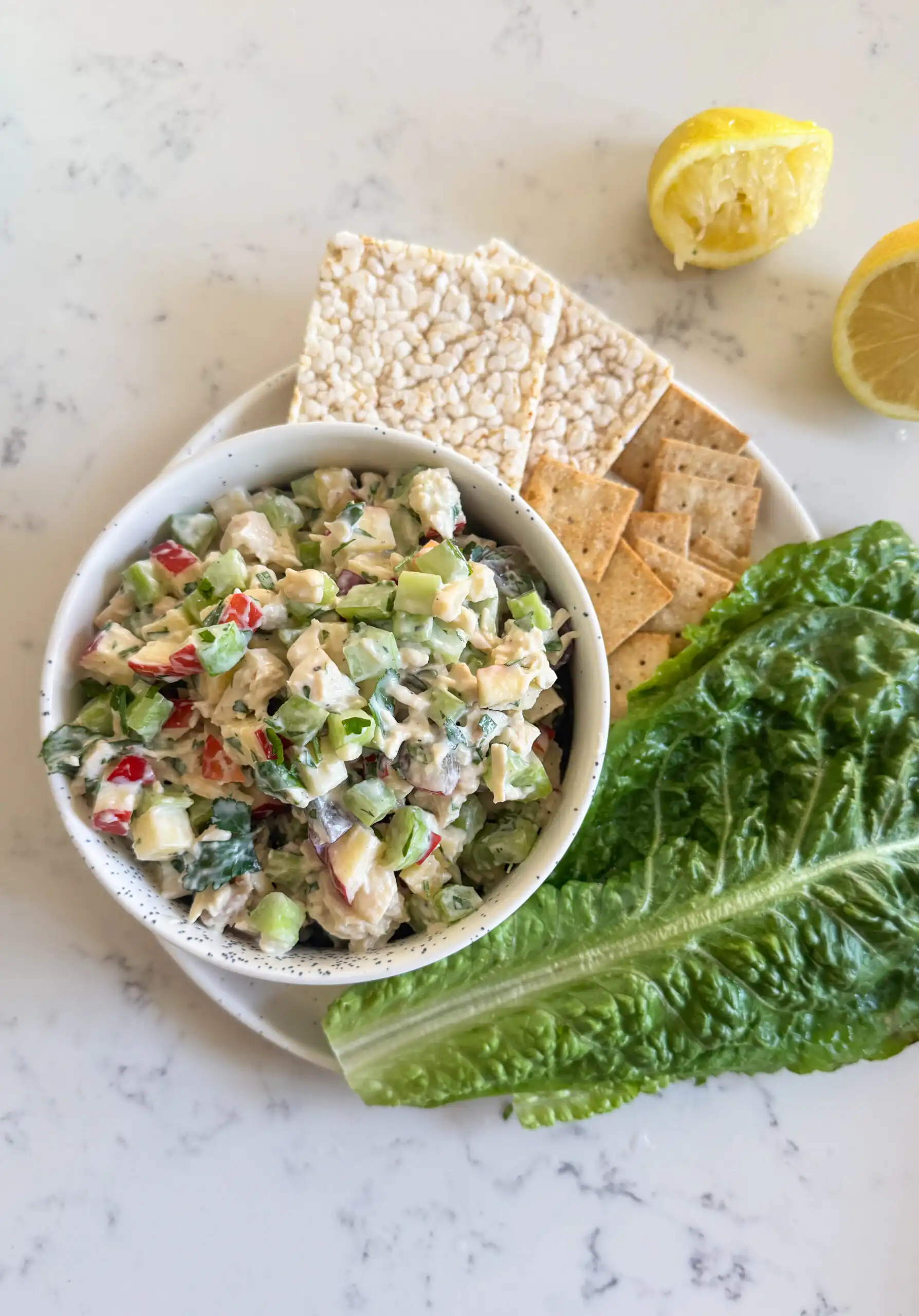 This Waldorf Chicken Salad is a new favorite for lunch – it’s fresh, crunchy, slightly sweet, and super satisfying. I like to use rotisserie chicken to keep things simple and quick and love how much crunch and texture you get from the apples, celery, grapes, and nuts. It’s one of those lunches that feels light but still keeps you full. I love it scooped over a salad, wrapped up in romaine lettuce wraps, or with crackers. See the recipe below.