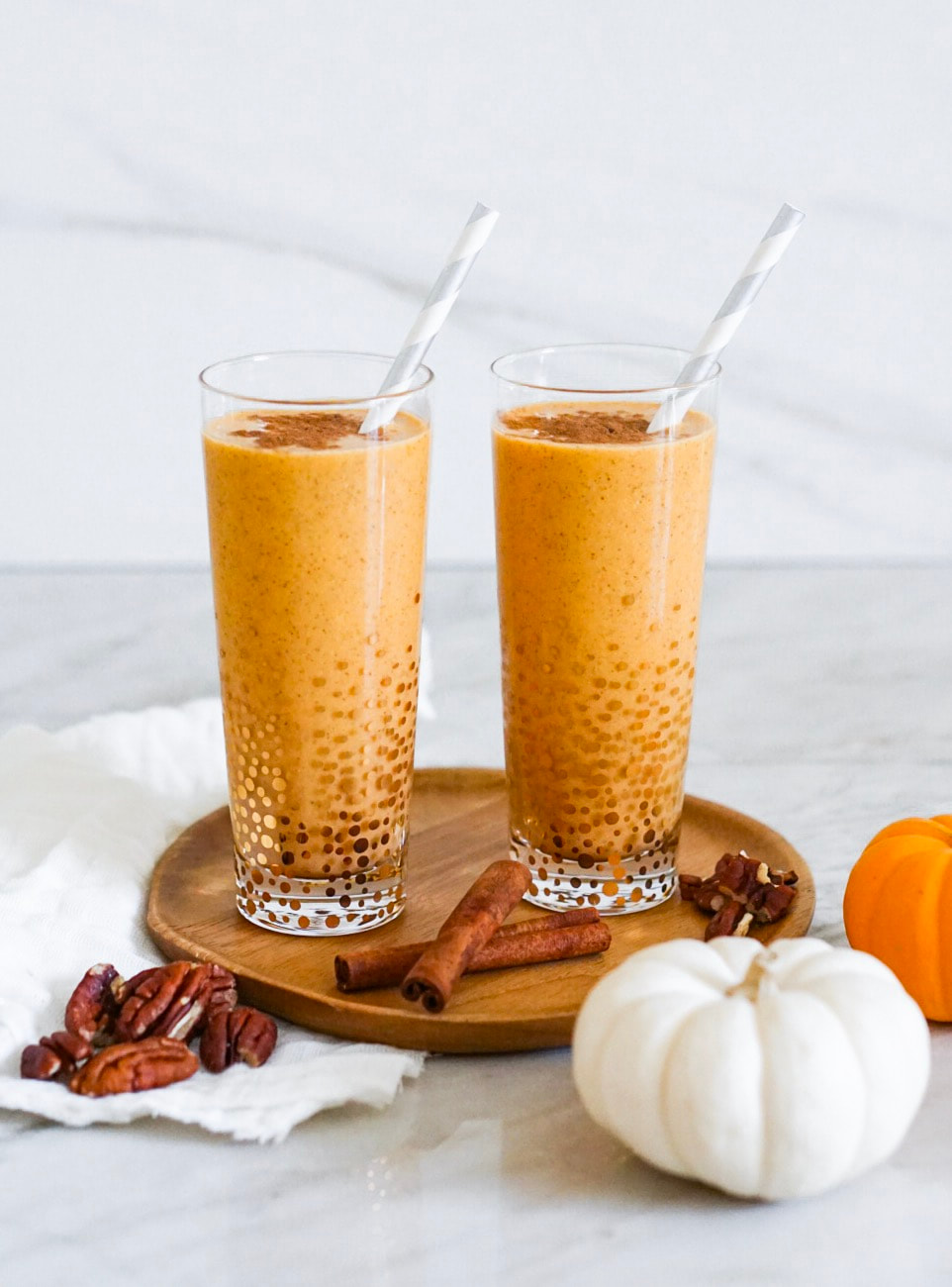 Can someone please explain to me how weโre already in the middle of Fall? Maybe itโs the 90-100ยฐ LA weather that’s tricking me into thinking we’re still in the midst of the hottest summer ever, rather than nearing the end of October. Normally during this time of year, I canโt wait to break out my loaf pans and whip up some chocolate chip pumpkin bread, but the combination of this record heat plus our broken AC unit has kept me far away from the kitchen. Iโve been trying to think of a way to get in the Fall spirit while avoiding my overheated little kitchen, and my Babรฉ-le (my amazing grandma-in-law) gave me the perfect idea โ a healthy pumpkin smoothie! Cool, refreshing, and festive โ exactly what I was craving! You’ll love it!
