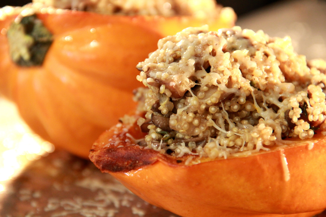 - Remove squash from oven and heat broiler. Using a spoon, scoop out a couple tablespoons of squash flesh from the inside of the squash, and mix it in with the quinoa-mushroom medley. Season with salt and pepper if necessary.