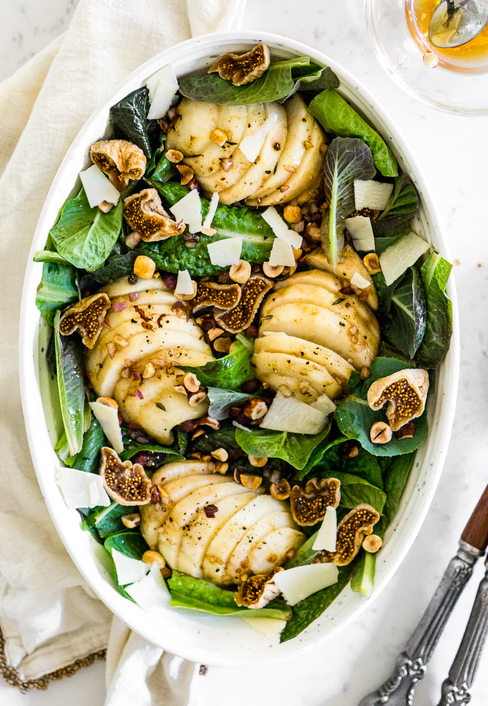 This gorgeous Fall salad originally made it’s way to the blog in October of 2013. I was in the midst of a part-time cooking program in LA and learned this technique to roast pears on a bed of herbs, drizzled with honey, and seasoned with salt and pepper, and it became my go-to when I wanted to make an elegant, flavorful salad that was just a little different and more festive than my usual. I figured it was time to update the photos to do this recipe justice, but I couldn’t bear to delete the old cooking video, so I’ll save that for ya at the end! While sometimes I cringe watching these old videos (which I once spent hours editing on iMovie at the wee hours of the night!), it’s a peek into my mid-20s and I figure I should keep them for the memories! Ok back to the salad! This one would be such a beauty on your Thanksgiving table and a total hit for our intimate Thanksgiving celebrations this year!