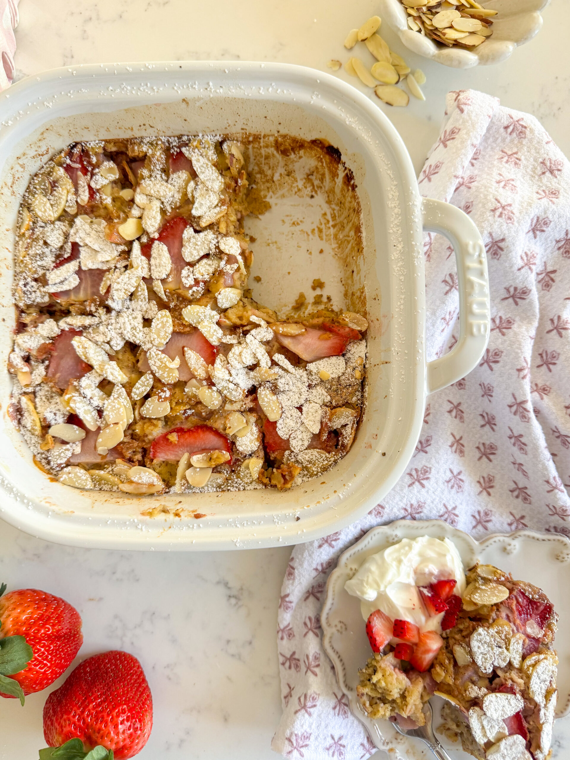This recipe came together when I wanted something bright and springy, but still satisfying and full of nutrients. The strawberries bake down adding sweetness to the oats, paired with lots of almond goodness from the almond extract in the base and a drizzle of almond butter and sliced almonds on top โ so every bite has that subtle, bakery-style richness that makes it feel a little extra. I made this version without protein powder because thatโs a request I get pretty often in the DMs. If you want to boost the protein, I love serving it with a big scoop of Greek yogurt on top โ it pairs perfectly with the strawberry + almond flavors and makes it even more satiating.