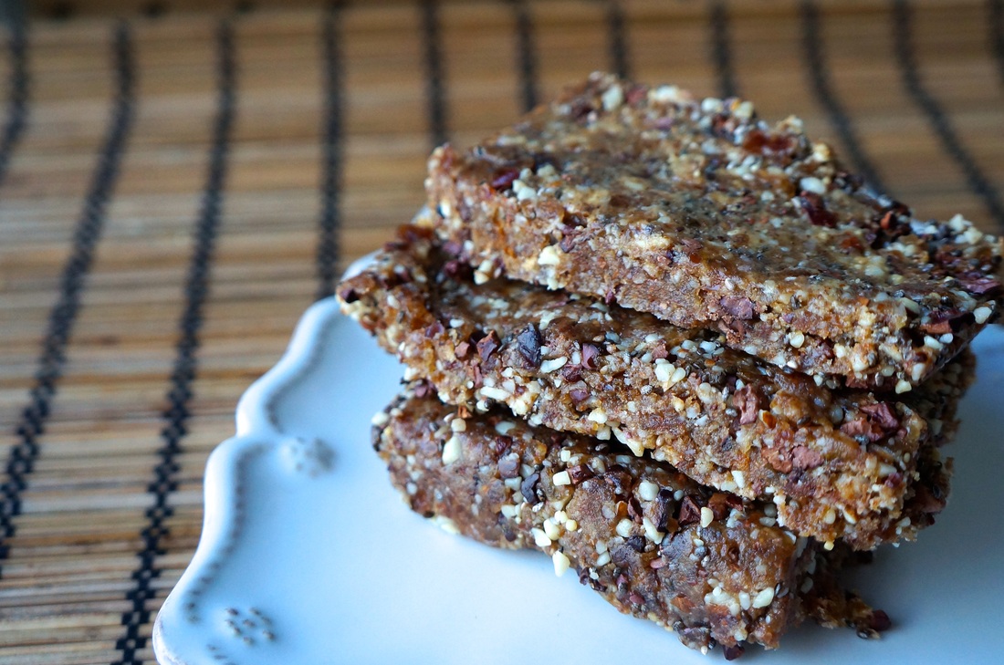 Larabars are my go-to snacks to help get me through the 3pm lull at work. What I love about them is their simplicity – just 3 or 4 natural ingredients, nothing fake, nothing I can’t pronounce. It’s the perfect little pick me up, but I’ve been getting tired of stocking up on them every single week and spending way too much on these little 3-ingredient bars. I figured, since they’re so simple and I always have the ingredients on hand, I’m going to be domestic and cost-efficient and make my own Larabars. Then when I started making them, I kept adding more and more ingredients to my mini food processor, and the result was a thousand times better than even my favorite Chocolate Chip Cookie Dough Larabar. I threw in a bunch of superfoods and added some cinnamon and salt for my favorite salty-sweet combo, taste tested-along the way, and came up with none other than the Super Bar. It’s absolutely delicious right out of the fridge and has the perfect consistency – a little bit soft and a little bit crunchy from the nuts and cacao nibs. And it’s packed with healthy ingredients and tons of satisfying flavors. I think I can confidently say that I’m going to ditch the Larabars and make a big batch of Super Bars every week to get me through my work days with extra pep and energy.