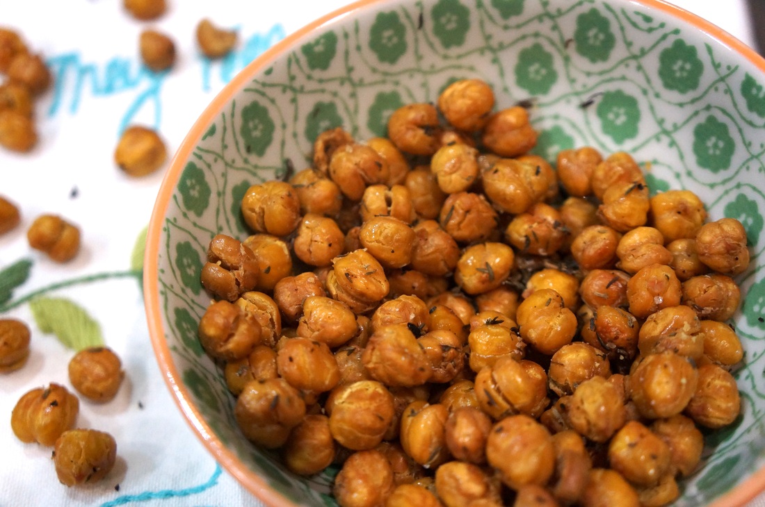Here’s my trick for the perfect roasted chickpeas. Rinse and rain your chickpeas and make sure to dry them completely. Any moisture will get in the way of delicious crunchiness.