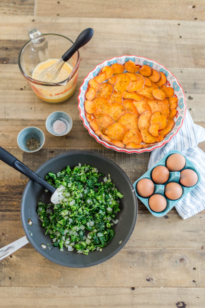 So the photos give you the gist of what you’ll need to do for this recipe. Basically, you’ll use sliced sweet potatoes as your “crust”, making this a nice and healthy Paleo brunch dish. You’ll sauté some onions, greens, and any other veggies you choose. Layer the veggies on the crust, pour the eggs over, top with cheese (if you so wish), bake it, and serve! Easy peasy!