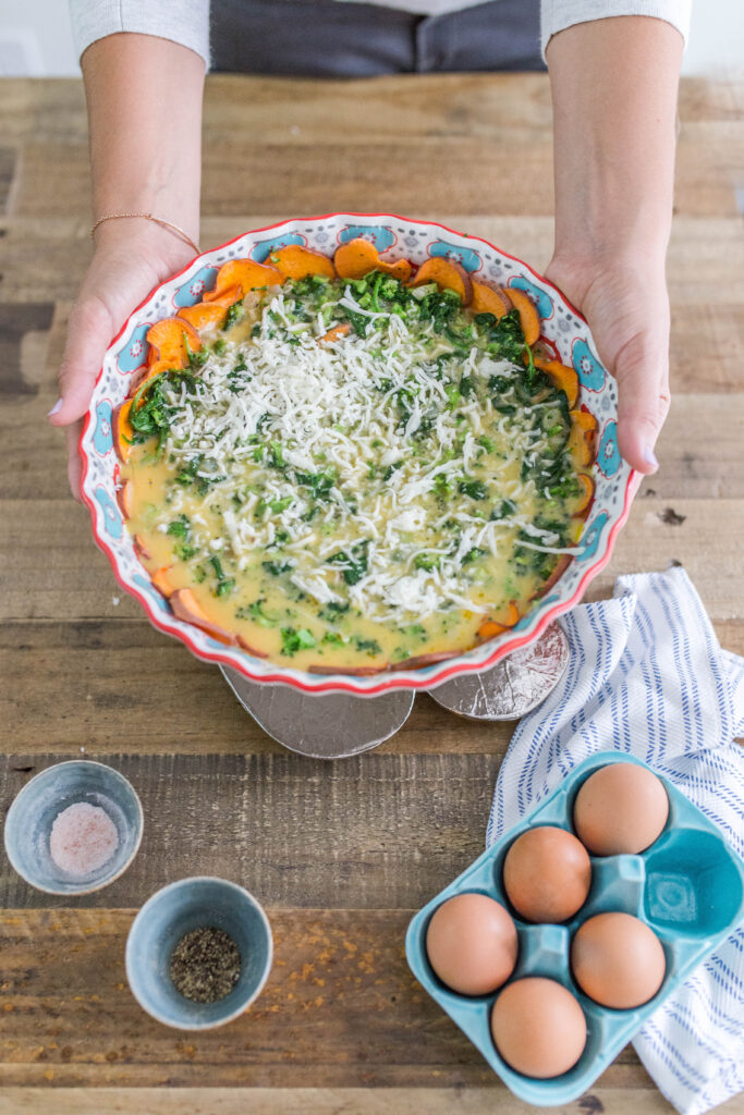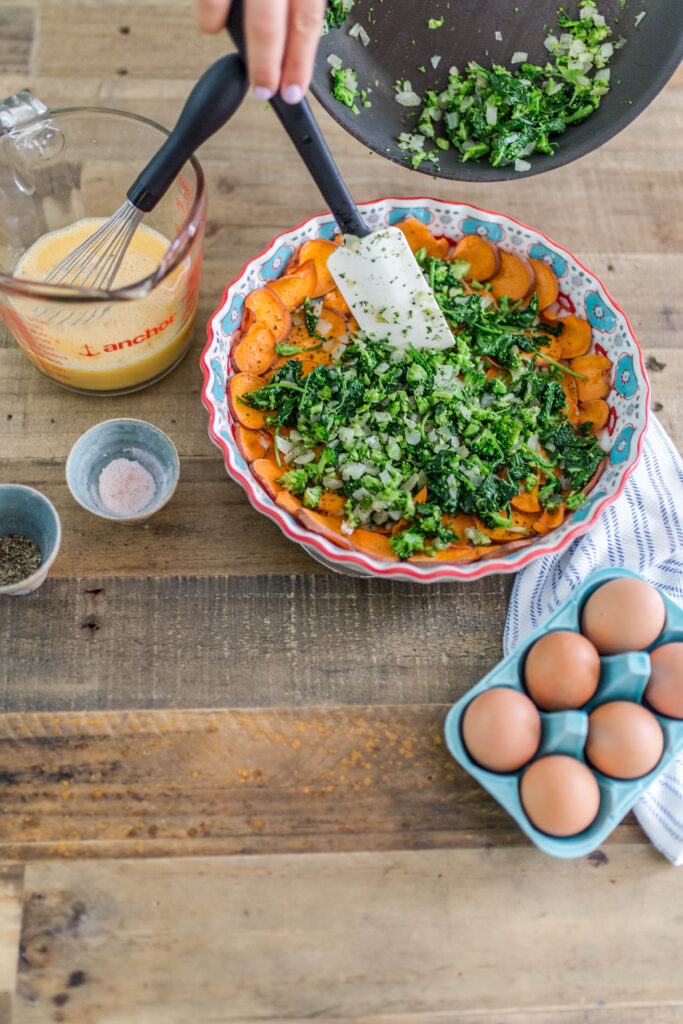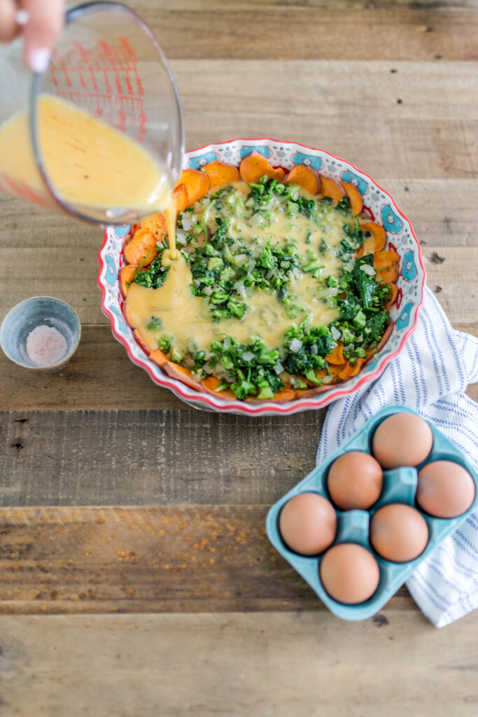 7. Arrange sautéed veggies in an even layer on the sweet potato crust. Then pour the whisked eggs over the