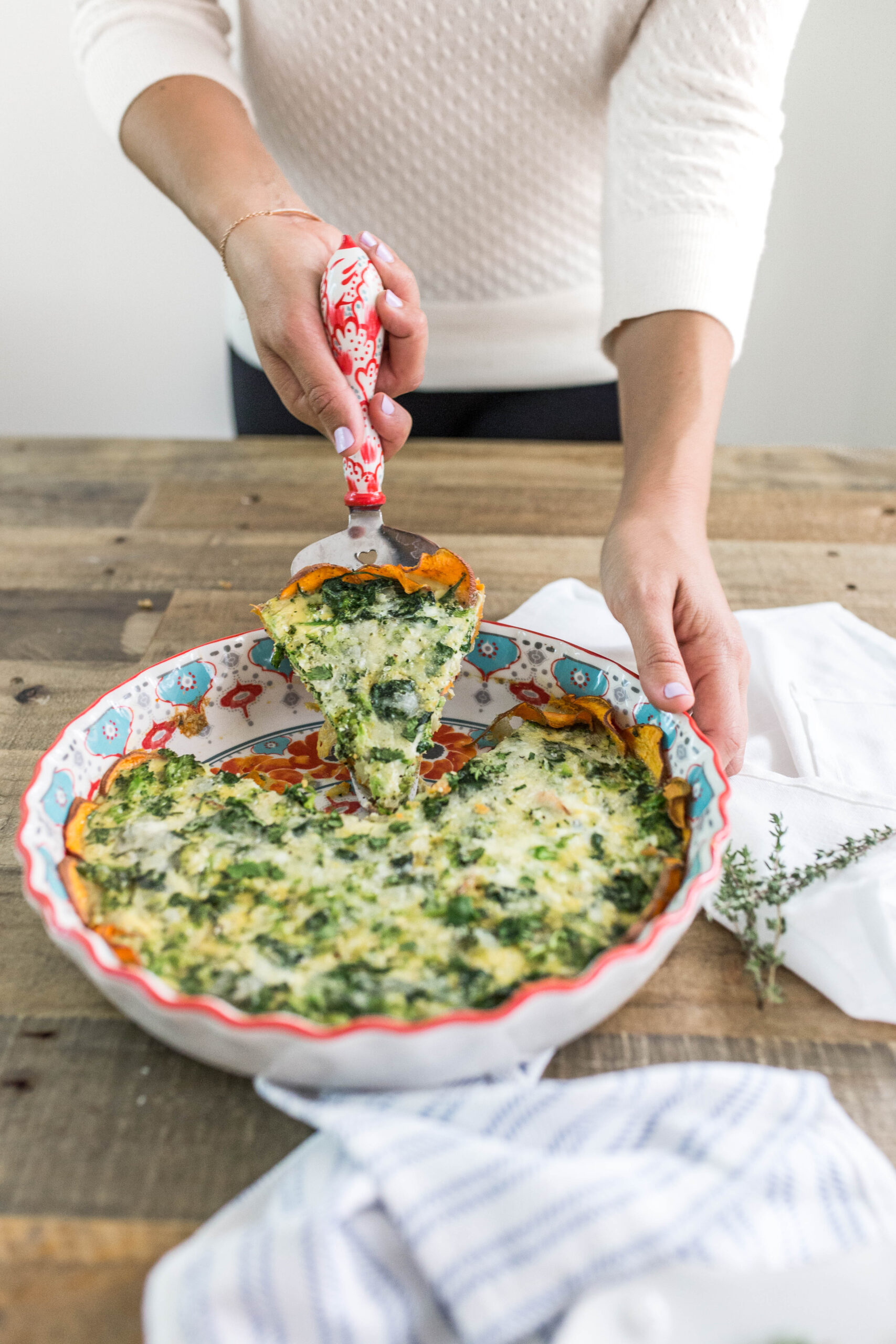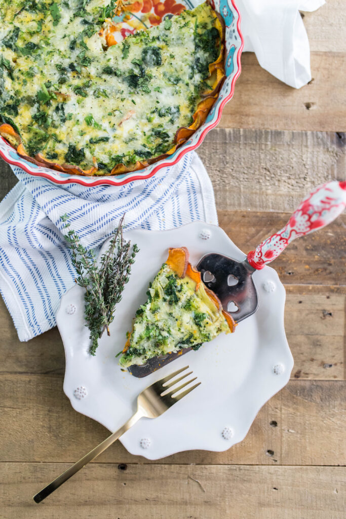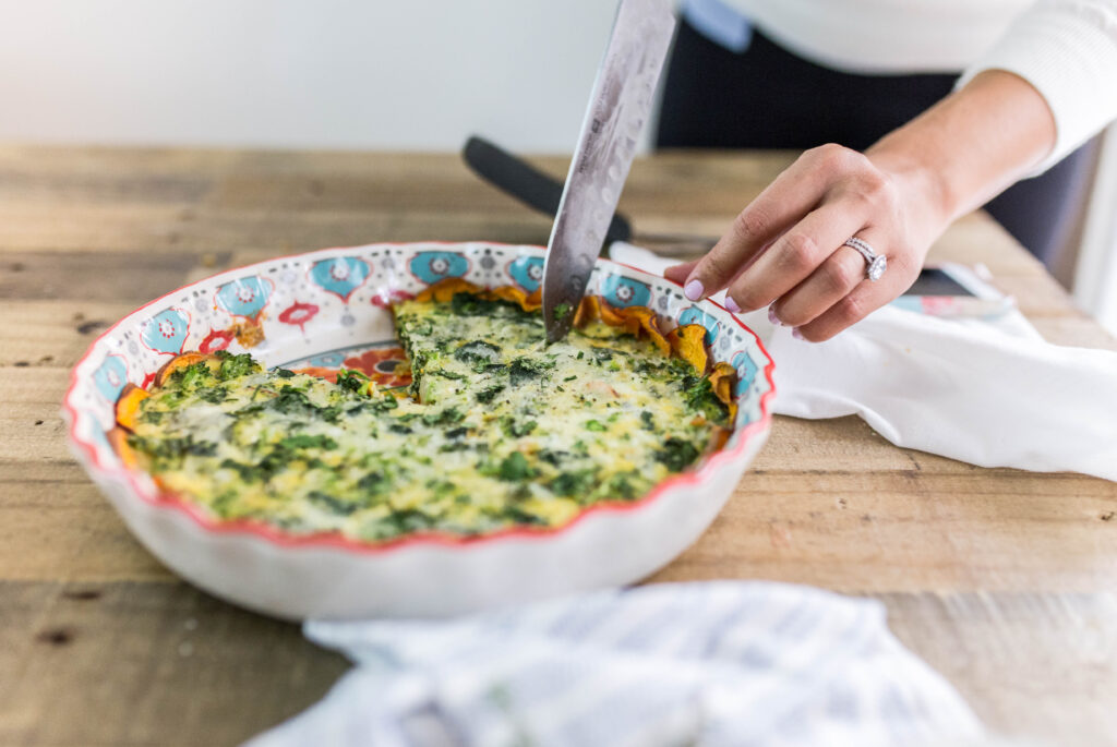 Sweet potato CRUST quiche! Get ready. I was inspired to try this out when I was flipping through Cooking Light the other day. While it looked like a lot of work, the article claimed that it was super easy to make. I’m happy to report that it was as simple as could be and also SO delicious. Since making it the first time, I’ve now tried it with a variety of veggies, sometimes with cheese, sometimes without, and it’s perfect every time – really a no-fail recipe! This is the ideal thing to make on a Sunday so that breakfast is ready to go throughout the week. Or if you’re hosting a brunch, whip this up and impress all of your friends. I made it for my pajama party birthday brunch (because you’re never too old for a pajama party, right?) and it was a huge hit! a