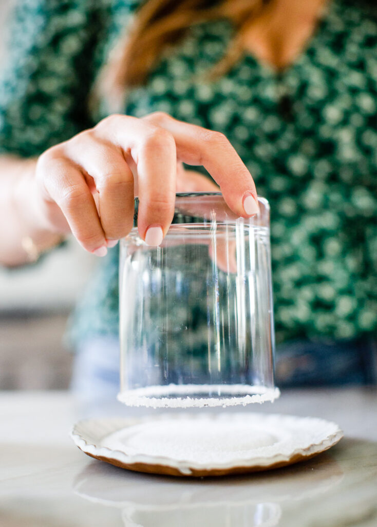- Pour coarse salt into a small dish. Run a lime wedge over the rims of two glasses, then dip them into the salt. Add the lime on the rims for garnish & pour ice into the glasses.