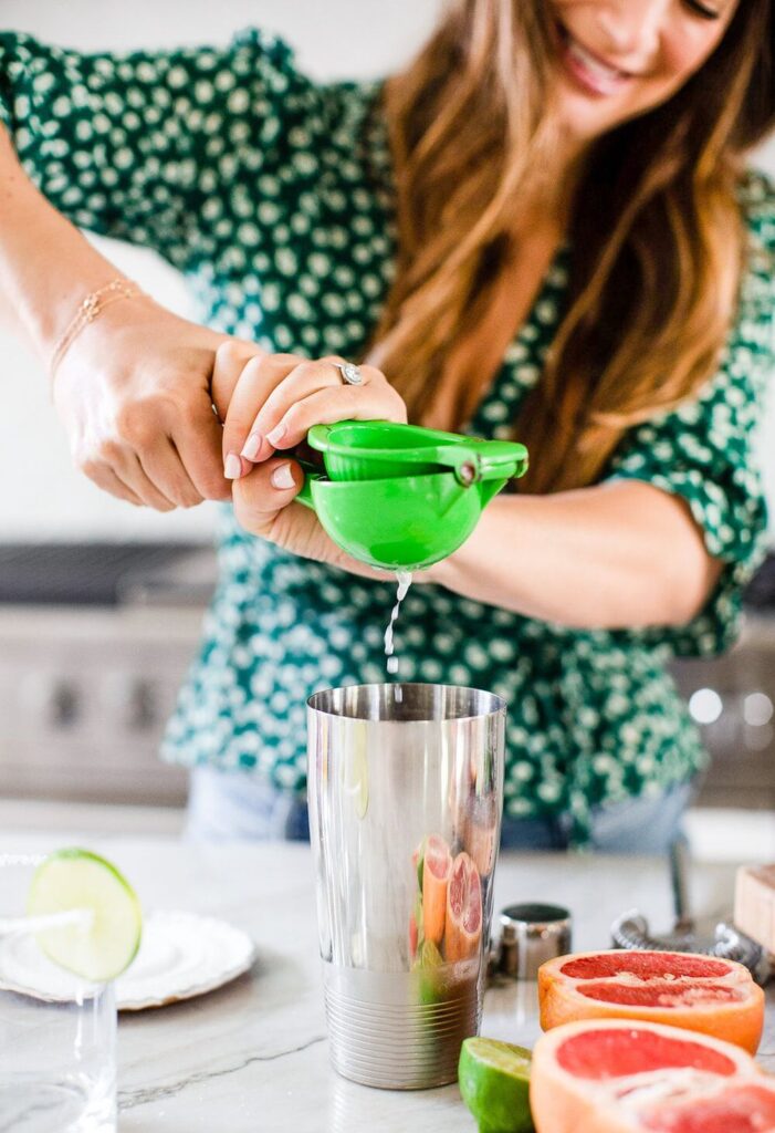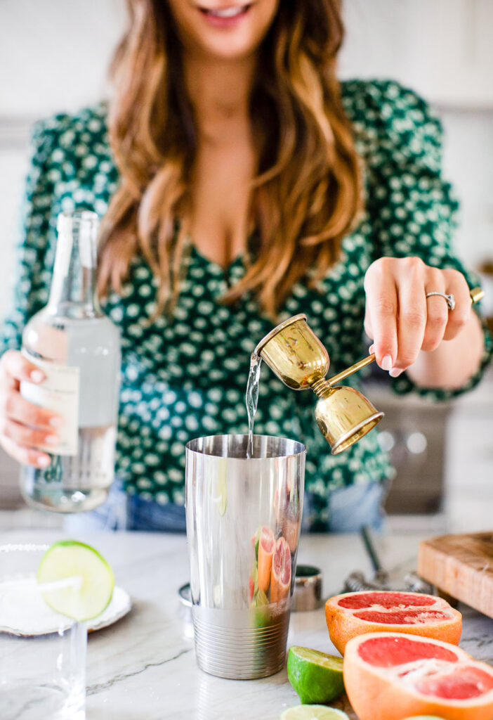 - Add ice into a cocktail shaker. Pour 3 ounces of your favorite tequila into the shaker. Next, juice 1 grapefruit and 1 lime into the shaker. Put the lid on and shake shake shake!