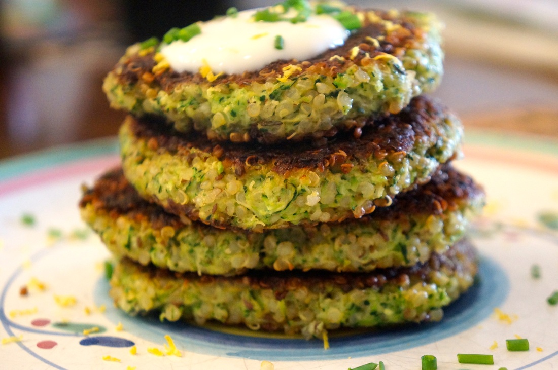 There is one MAJOR key to success with these Zucchini Quinoa Fritters: Make sure your zucchini is completely DRY before you mix it with your other ingredients and make your patties. Otherwise you will end up with soggy fritters, and no one wants that! Zucchini is 95% water, so it will take a bit of effort to get the shredded zukes totally dry. After you shred the zucchini, just put it in a mesh strainer and allow the water to empty into a bowl below. You’ll be amazed how much strains without you even pushing it (and how bright green it is!)! Then pat it down with paper towels, or roll the zucchini up into a paper towel and wring it out. When most of the moisture is out, move forward with the rest of the ingredients!