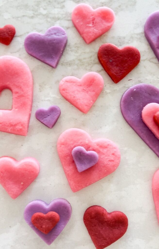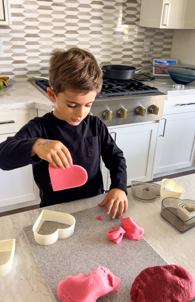 My mother-in-law has been making homemade play dough since my husband was little, and now she loves doing it with her grandkids. She gave me and Noah a lesson last time we were visiting, and I couldn’t believe how easy it was and just how much better it is than store-bought. It’s so simple and fun to make, a great activity with the kids, and this recipe makes the softest, best play dough ever. And it makes a ton of it — forget those small little containers, I’ll never go store-bought again! We went with pink, red, and purple play dough & heart cookie cutters for a very Valentine’s theme. Hope you and your littles enjoy playing with it as much as we do!