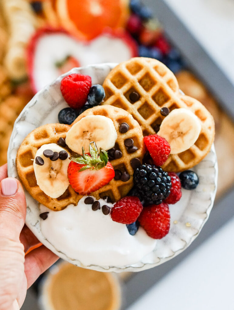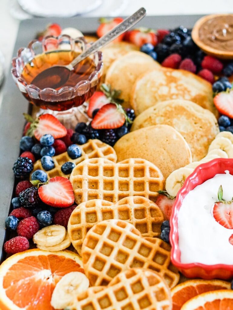 As far as the rest of the board goes, just get creative and add any of your favorite pancake and waffle toppings! You literally can’t go wrong and the more full and vibrant your board is, the better!