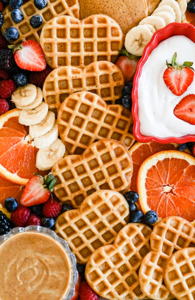 You could always go totally homemade and whip up your pancakes and waffles from scratch for this board, but to make things easy, I used a box of Simple Mills pancake & waffle mix. It’s made with simple ingredients like almond flour and coconut sugar, and all you have to do is follow the instructions on the back of the box and add oil (I use coconut oil or avocado oil), eggs, and unsweetened nut milk. I also like to add a sprinkle of cinnamon and a splash of vanilla for some extra flavor. You could use any waffle maker but this little heart-shaped one adds a fun touch and may be the best $13 I’ve spent in a while!