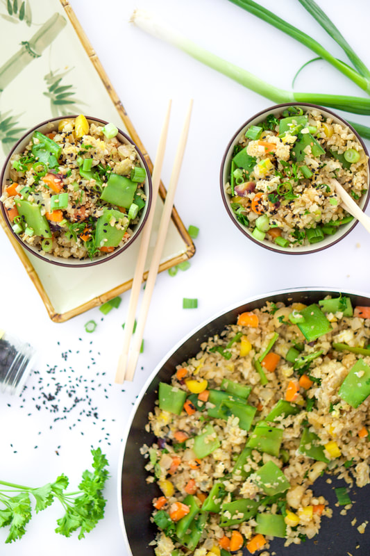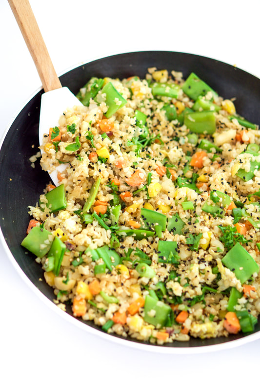 Fried rice always always brings back the same childhood memories of going to dinner with my family at our nearby teppanyaki restaurant called Samurai. We’d sit around the stove and watch the chef show off some cool tricks and cook up huge amounts of fried rice, with chicken, shrimp, and steak. We’d always leave dinner super full, and our hair and clothes always smelled like fried rice afterwards. I have to say, it’s been a longgg time since I’ve ordered fried rice at a restaurant, but I definitely get hit with the craving from time to time. When that happens, this Cauliflower “Fried Rice” really does the trick! It’s healthy, full of flavor, packed with nutrients, and doesn’t leave me smelling like I bathed in oil and soy sauce!